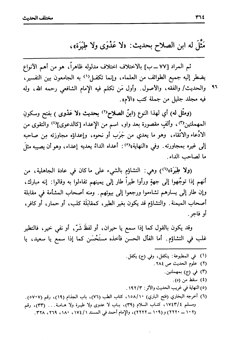 (ومثّل لَهُ) أَي لهَذَا النَّوْع (ابنُ الصّلاح بِحَدِيث " لَا عَدوى ") بِفَتْح وَسُكُون الْمُهْمَلَتَيْنِ وألفٍ مَقْصُورَة بعد وَاو، اسْم من الإعداء [كالدعوى] وَالتَّقوى من والأدعاء والاتقاء، وَهُوَ مَا يعدي من جَرَب أَو نَحوه، وإعداؤه مجاوزته مِن صَاحبه إِلَى غَيره بمجاورته. وَفِي " النِّهَايَة ": أعداه الداءُ يعديه إعداد، وَهُوَ أَن يُصِيبهُ مثل مَا لصَاحب الدَّاء.