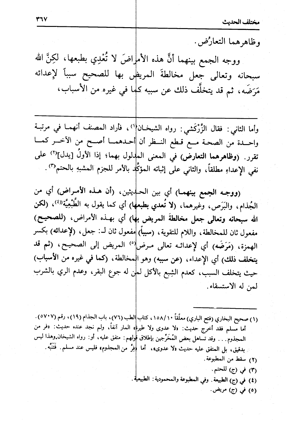 وَأما الثَّانِي: فَقَالَ الزَّرْكَشي: رَوَاهُ الشَّيْخَانِ، فَأَرَادَ المُصَنّف أَنَّهُمَا فِي مرتبَة وَاحِدَة من الصِّحَّة مَعَ قطع النّظر أَن أَحدهمَا أصح من الآخر كَمَا تقرر. (وظاهرهما التَّعَارُض) فِي الْمَعْنى الْمَدْلُول بهما؛ إِذا الأول [يدل] على نفي الإعداءِ مُطلقًا، وَالثَّانِي على إثْبَاته الْمُؤَكّد بِالْأَمر للجزم المشبهِ بالحتم