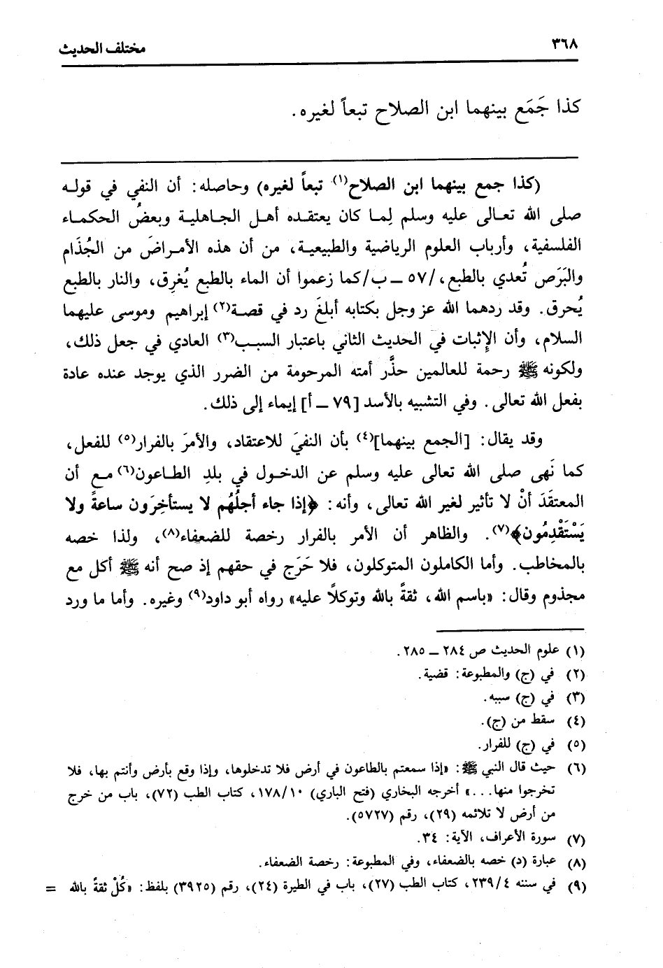 (كَذَا جمع بَينهمَا ابْن الصّلاح تبعا لغيره) وَحَاصِله: أَن النَّفْي فِي قَوْله [صلى الله عَلَيْهِ وَسلم] لِما كَانَ يَعْتَقِدهُ أهل الْجَاهِلِيَّة وبعضُ الْحُكَمَاء الفلسفية، وأرباب الْعُلُوم الرياضية والطبيعية، من أَن هَذِه الْأَمْرَاض من الجُذَام والبَرَص تُعدي بالطبع، / 75 - ب / كَمَا زَعَمُوا أَن المَاء بالطبع يُغرِق، وَالنَّار بالطبع يُحرق. وَقد ردهما الله عز وَجل بكتابه أبلغ رد فِي قصَّة إِبْرَاهِيم ومُوسَى عَلَيْهِمَا السَّلَام، وَأَن الْإِثْبَات فِي الحَدِيث الثَّانِي بِاعْتِبَار السَّبَب العادي فِي جعل ذَلِك، ولكونه [صلى الله عَلَيْهِ وَسلم] رَحمَه للْعَالمين حذَّر أمته المرحومة من الضَّرَر الَّذِي يُوجد عِنْده عَادَة بِفعل الله تَعَالَى. وَفِي التَّشْبِيه بالأسد [79 - أ] إِيمَاء إِلَى ذَلِك. وَقد يُقَال: [الْجمع بَينهمَا] بِأَن النَّفْي للاعتقاد، والأمرَ بالفرار للْفِعْل، كَمَا نَهى [صلى الله عَلَيْهِ وَسلم] عَن الدُّخُول فِي بلدِ الطَّاعُون مَعَ أَن المعتقد أنْ لَا تَأْثِير لغير الله تَعَالَى، وَأَنه: {إِذا جَاءَ أَجلهم لَا يَسْتَأْخِرُونَ سَاعَة وَلَا يَسْتَقْدِمُونَ} وَالظَّاهِر أَن الْأَمر بالفرار رخصَة للضعفاء، وَلذَا خصّه بالمخاطب. وَأما الكاملون المتوكلون، فَلَا حَرج فِي حَقهم إِذْ صَحَّ أَنه [صلى الله عَلَيْهِ وَسلم] أكل مَعَ مجذوم وَقَالَ: " باسم الله، ثِقَة بِاللَّه وتوكلاً عَلَيْهِ " رَوَاهُ أَبُو دَاوُد وَغَيره. وَأما مَا ورد