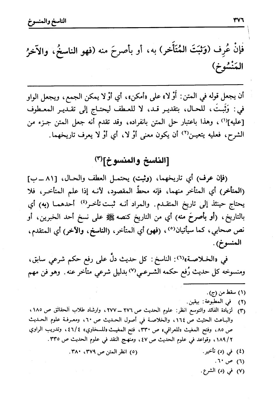 فِي " الْخُلَاصَة ": النَّاسِخ: كل حَدِيث دلَّ على رفع حكم شَرْعِي سَابق، ومنسوخه كل حَدِيث رُفع حكمه الشَّرْعِيّ بِدَلِيل شَرْعِي مُتَأَخّر عَنهُ. وَهُوَ فن مُهِمّ