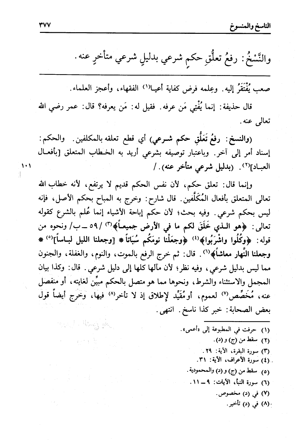 (والنسخ: رفعُ تعلق حكم شرع) أَي قطع تعلقه بالمكلفين. وَالْحكم: إِسْنَاد أَمر إِلَى آخر. بِاعْتِبَار توصيفه بشرعي أُرِيد بِهِ الْخطاب الْمُتَعَلّق [بِأَفْعَال الْعباد] . (بِدَلِيل شَرْعِي مُتَأَخّر عَنهُ) . /