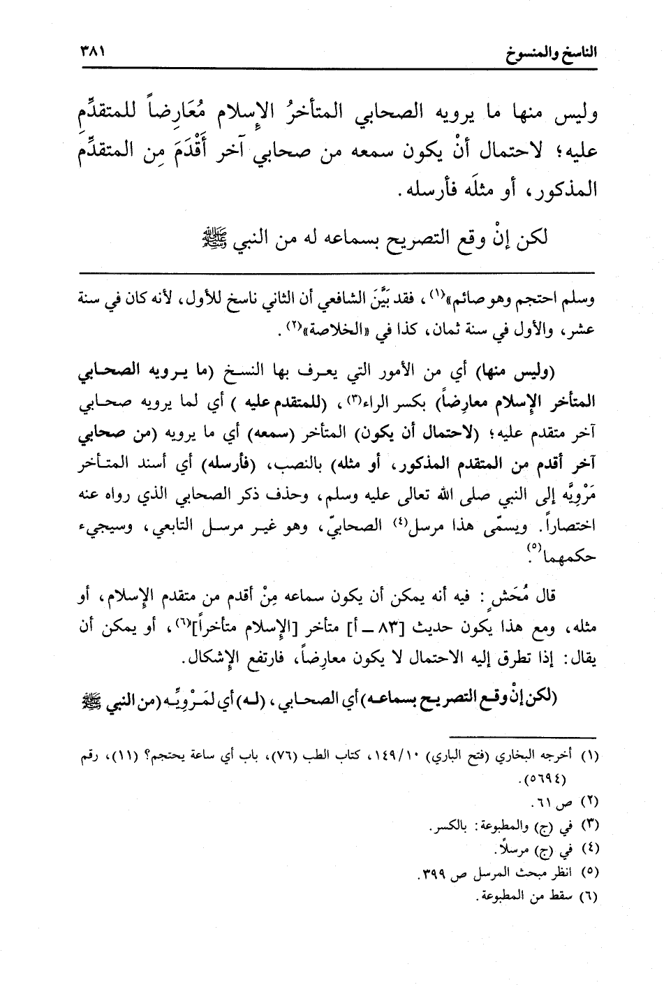 (وَلَيْسَ مِنْهَا) أَي من الْأُمُور الَّتِي يعرف بهَا النّسخ (مَا يرويهِ الصَّحَابِيّ الْمُتَأَخر الْإِسْلَام معارِضاً) بِكَسْر الرَّاء، (للمتقدم عَلَيْهِ) أَي لما يرويهِ صَحَابِيّ آخر مُتَقَدم عَلَيْهِ؛ (لاحْتِمَال أَن يكون الْمُتَأَخر (سَمعه) أَي مَا يرويهِ (من صَحَابِيّ آخر أقوم من الْمُتَقَدّم الْمَذْكُور، أَو مثله) بِالنّصب، (فَأرْسلهُ) أَي أسْند الْمُتَأَخر مَرْوِيه إِلَى النَّبِي صلى الله تَعَالَى عَلَيْهِ وَسلم، وَحذف ذكر الصَّحَابِيّ الَّذِي رَوَاهُ عَنهُ اختصاراً. ويسمّى هَذَا مُرْسل الصَّحَابِيّ، وَهُوَ غير مُرْسل التَّابِعِيّ، وَسَيَجِيءُ حكمهمَا.
