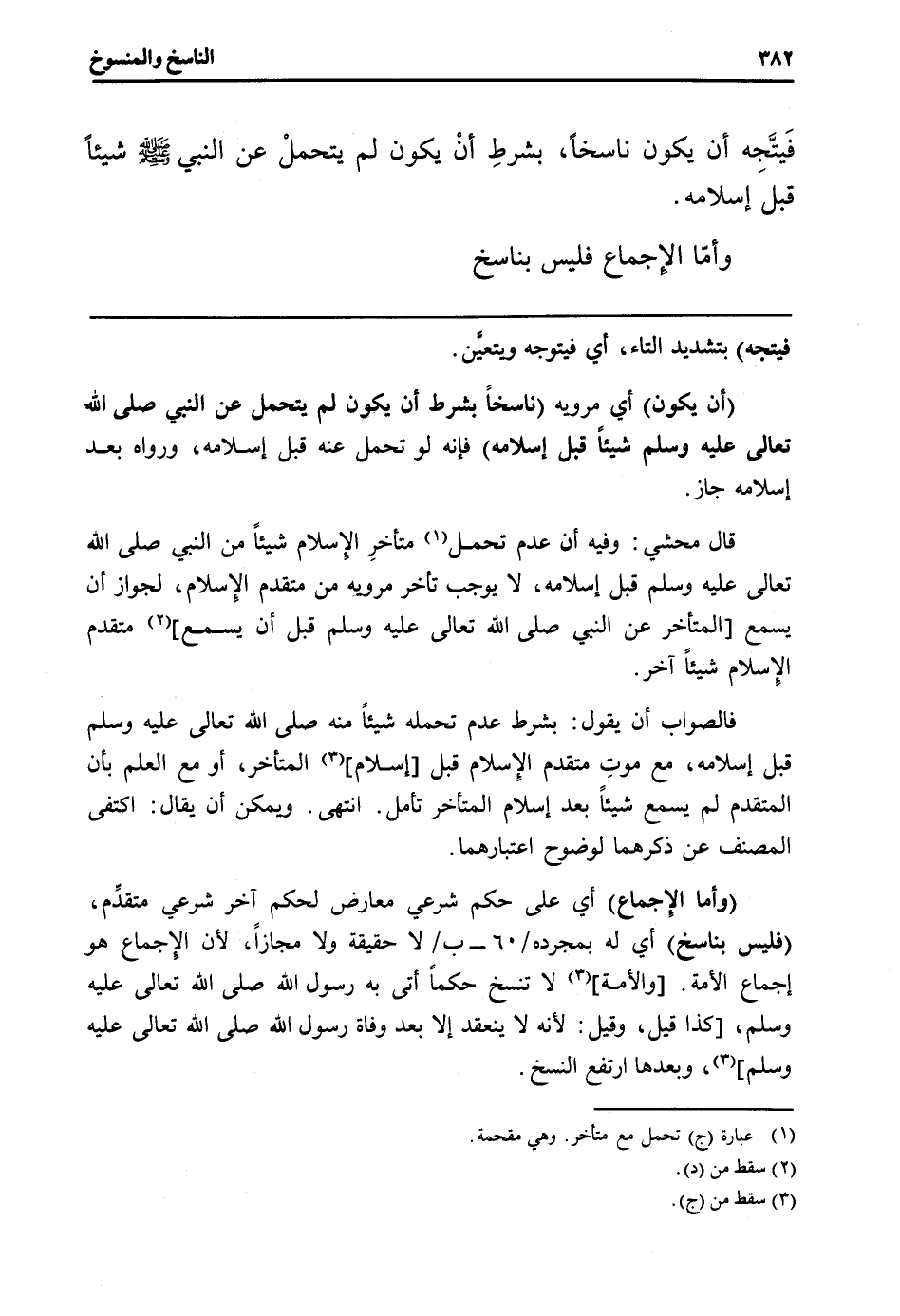 (وَأما الْإِجْمَاع) أَي على حكم شَرْعِي معَارض لحكم آخر شَرْعِي مُتَقَدم (فَلَيْسَ بناسخ) أَي لَهُ بِمُجَرَّدِهِ / 60 - ب / لَا حَقِيقَة وَلَا مجَازًا، لِأَن الْإِجْمَاع هُوَ إِجْمَاع الْأمة. [وَالْأمة] لَا تنسخ حكما أَتَى بِهِ رَسُول الله صلى الله تَعَالَى عَلَيْهِ وَسلم، [كَذَا قيل، وَقيل لِأَنَّهُ لَا ينْعَقد إِلَّا بعد وَفَاة رَسُول الله صلى الله تَعَالَى عَلَيْهِ وَسلم] ، وَبعدهَا ارْتَفع النّسخ.