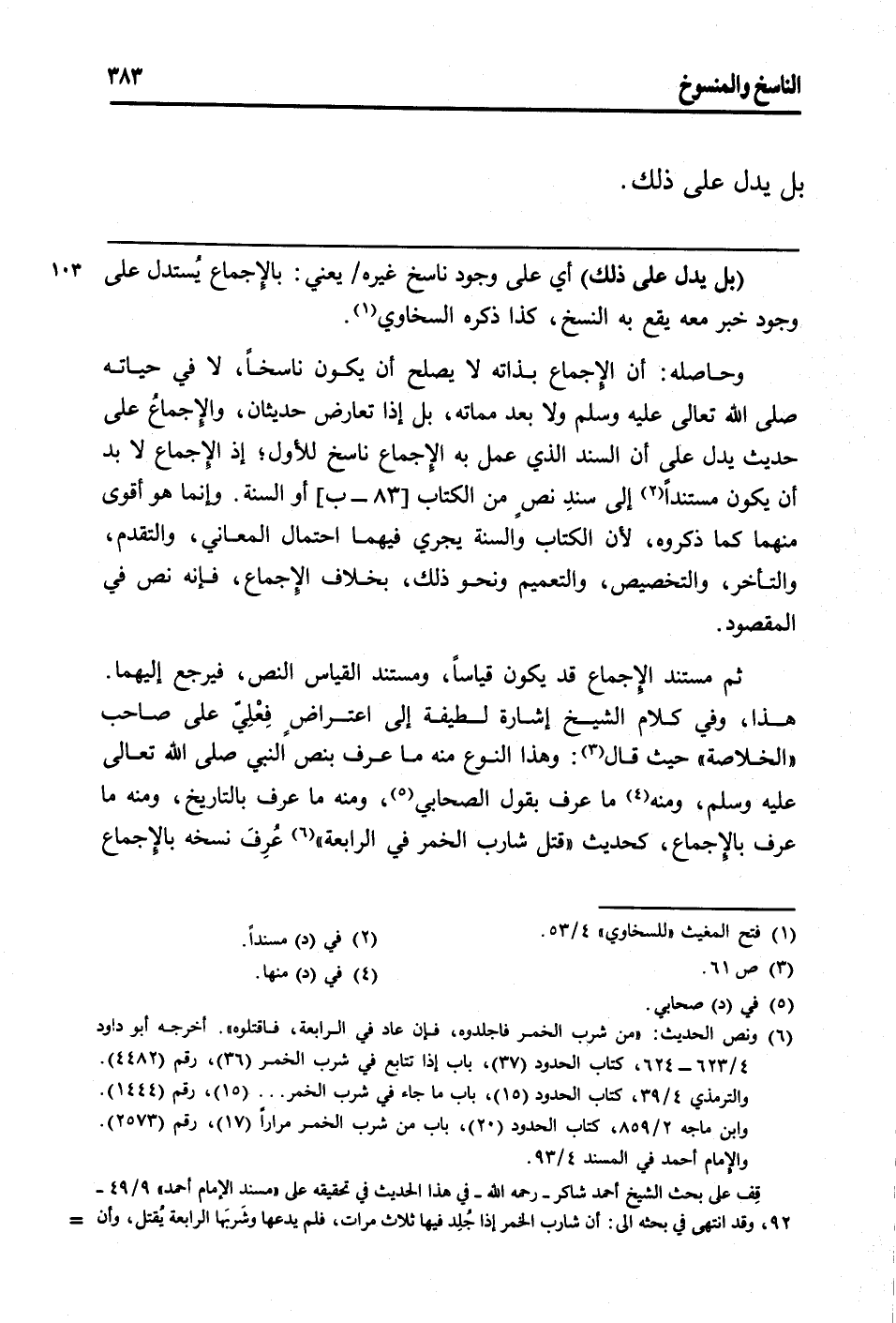 ثمَّ مُسْتَند الْإِجْمَاع قد يكون قِيَاسا، ومستند الْقيَاس النَّص، فَيرجع إِلَيْهِمَا. هَذَا، وَفِي كَلَام الشَّيْخ إِشَارَة لَطِيفَة إِلَى اعتراضٍ فِعْليّ على صَاحب " الْخُلَاصَة " حَيْثُ قَالَ: وَهَذَا النَّوْع مِنْهُ مَا عرف بِنَصّ النَّبِي صلى الله تَعَالَى عَلَيْهِ وَسلم، وَمِنْه مَا عرف بقول الصَّحَابِيّ، وَمِنْه مَا عرف بالتاريخ، وَمِنْه مَا عرف بِالْإِجْمَاع، كَحَدِيث " قتل شَارِب الْخمر فِي الرَّابِعَة " عُرِفَ نسخه بِالْإِجْمَاع