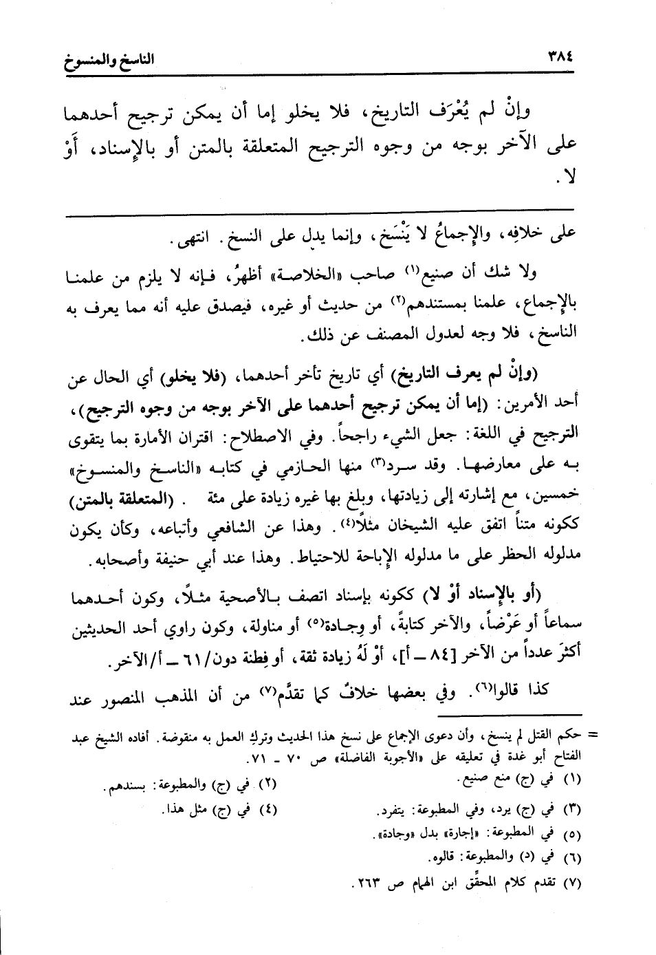 (وَإِن لم يعرف التَّارِيخ) أَي تَارِيخ تَأَخّر أَحدهمَا، (فَلَا يَخْلُو) أَي الْحَال عَن أحد الْأَمريْنِ: (إِمَّا أَن يُمكن تَرْجِيح أَحدهمَا على الآخر بِوَجْه من وُجُوه التَّرْجِيح) ، التَّرْجِيح فِي اللُّغَة: جعل الشَّيْء راجحاً. وَفِي الِاصْطِلَاح: اقتران الأمارة بِمَا يتقوى بِهِ على معارضها. وَقد سرد مِنْهَا الْحَازِمِي فِي كِتَابه " النَّاسِخ والمنسوخ " خمسين، مَعَ إِشَارَته إِلَى زيادتها، وَبلغ بهَا غَيره زِيَادَة على مئة. (الْمُتَعَلّقَة بِالْمَتْنِ) كَكَوْنِهِ متْنا اتّفق عَلَيْهِ الشَّيْخَانِ مثلا. وَهَذَا عَن الشَّافِعِي وَأَتْبَاعه، وَكَأن يكون مَدْلُوله الْحَظْر على مَا مَدْلُوله الْإِبَاحَة للِاحْتِيَاط. وَهَذَا عِنْد أبي حنيفَة وَأَصْحَابه.