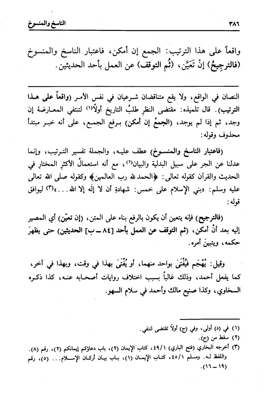 (فاعتبار النَّاسِخ والمنسوخ) عطف عَلَيْهِ، وَالْجُمْلَة تَفْسِير التَّرْتِيب، وَإِنَّمَا عدلنا عَن الْجَرّ على سَبِيل الْبَدَلِيَّة وَالْبَيَان، مَعَ أَنه استعمالُ الأكثرِ الْمُخْتَار فِي الحَدِيث وَالْقُرْآن كَقَوْلِه تَعَالَى: {الْحَمد لله رب الْعَالمين} وَكَقَوْلِه صلى الله تَعَالَى عَلَيْهِ وَسلم: " بني الْإِسْلَام على خمس: شهادِة أَن لَا إِلَه إِلَّا الله ... " ليُوَافق قَوْله: