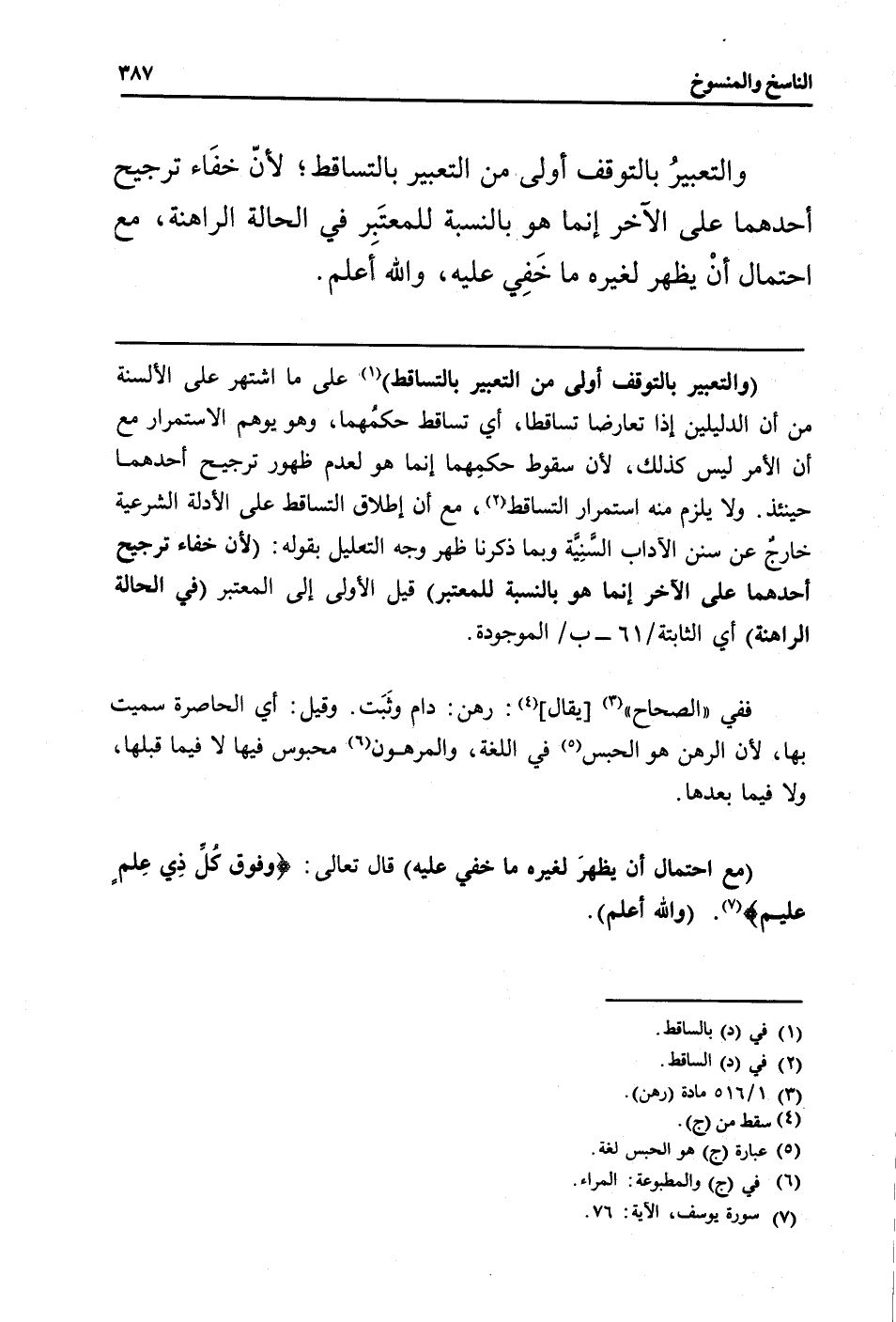 (وَالتَّعْبِير التَّوَقُّف أولى من التَّعْبِير بالتساقط) على مَا اشْتهر على الْأَلْسِنَة من أَن الدَّلِيلَيْنِ إِذا تَعَارضا تساقطا، أَي تساقط حكمهمَا، وَهُوَ يُوهم الِاسْتِمْرَار مَعَ أَن الْأَمر لَيْسَ كَذَلِك، لِأَن سُقُوط حكمهمَا إِنَّمَا هُوَ لعدم ظُهُور تَرْجِيح أَحدهمَا حِينَئِذٍ. وَلَا يلْزم مِنْهُ اسْتِمْرَار التساقط، مَعَ أَن إِطْلَاق التساقط على الْأَدِلَّة الشَّرْعِيَّة خَارج عَن سنَن الْآدَاب السّنيَّة وَبِمَا ذكرنَا ظهر وَجه التَّعْلِيل بقوله: (لِأَن خَفَاء تَرْجِيح أَحدهمَا على الآخر إِنَّمَا هُوَ بِالنِّسْبَةِ للمعتبر) قيل الأولى إِلَى الْمُعْتَبر (فِي الْحَالة الراهنة) أَي الثَّابِتَة / 61 - ب / الْمَوْجُودَة.