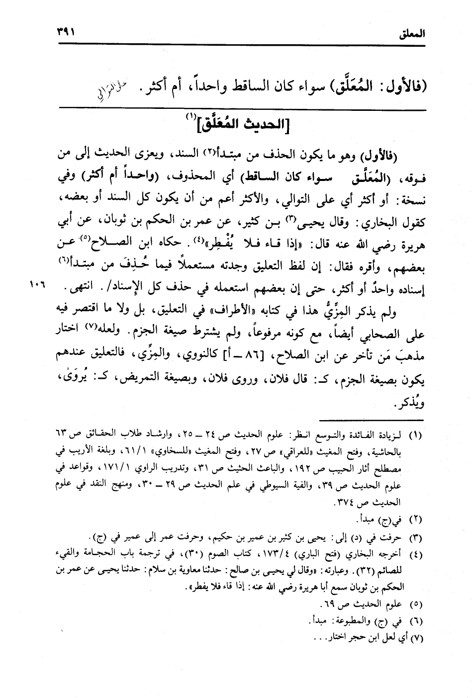 (فَالْأول) وَهُوَ مَا يكون الْحَذف من مُبْتَدأ السَّنَد، ويعزى الحَدِيث إِلَى من فَوْقه (الْمُعَلق سَوَاء كَانَ السَّاقِط) أَي الْمَحْذُوف، (وَاحِدًا أم أَكثر) وَفِي نُسْخَة: أَو أَكثر أَي على التوالي، وَالْأَكْثَر أَعم من أَن يكون كل السَّنَد أَو بعضه، كَقَوْل البُخَارِيّ: وَقَالَ يحيى بن كثير، عَن عمر بن الحكم بن ثَوْبَان، عَن أبي هُرَيْرَة رَضِي الله عَنهُ قَالَ: " إِذا قاء فَلَا يفْطر ". حَكَاهُ ابْن الصّلاح عَن بَعضهم، وَأقرهُ فَقَالَ: إِن لفظ التَّعْلِيق وجدته مُسْتَعْملا فِيمَا حذف من مُبْتَدأ إِسْنَاده وَاحِد أَو أَكثر، حَتَّى إِن بَعضهم اسْتَعْملهُ فِي حذف كل الْإِسْنَاد /. انْتهى.