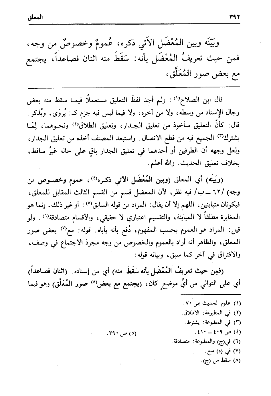 (وَبَينه) أَي الْمُعَلق (وَبَين المُغْضَل الْآتِي ذكره، عُمُوم وخصوص من وَجه) / 62 - ب / فِيهِ نظر، لِأَن المعضل قسم من الْقسم الثَّالِث الْمُقَابل للمعلق، فيكونان متباينين، اللَّهُمَّ إِلَّا أَن يُقَال: المُرَاد من قَوْله السَّابِق: أَو غير ذَلِك، إِنَّمَا هُوَ الْمُغَايرَة مُطلقًا لَا المباينة، والتقسيم اعتباري لَا حَقِيقِيّ، والأقسام متصادقة. وَلَو قيل: المُرَاد هُوَ الْعُمُوم بِحَسب الْمَفْهُوم، دُفع بِأَنَّهُ يأباه. قَوْله: مَعَ بعض صور الْمُعَلق، وَالظَّاهِر أَنه أَرَادَ بِالْعُمُومِ وَالْخُصُوص من وَجه مجردَ الِاجْتِمَاع فِي وصف، والافتراق فِي آخر كَمَا سبق، وَبَيَانه قَوْله: