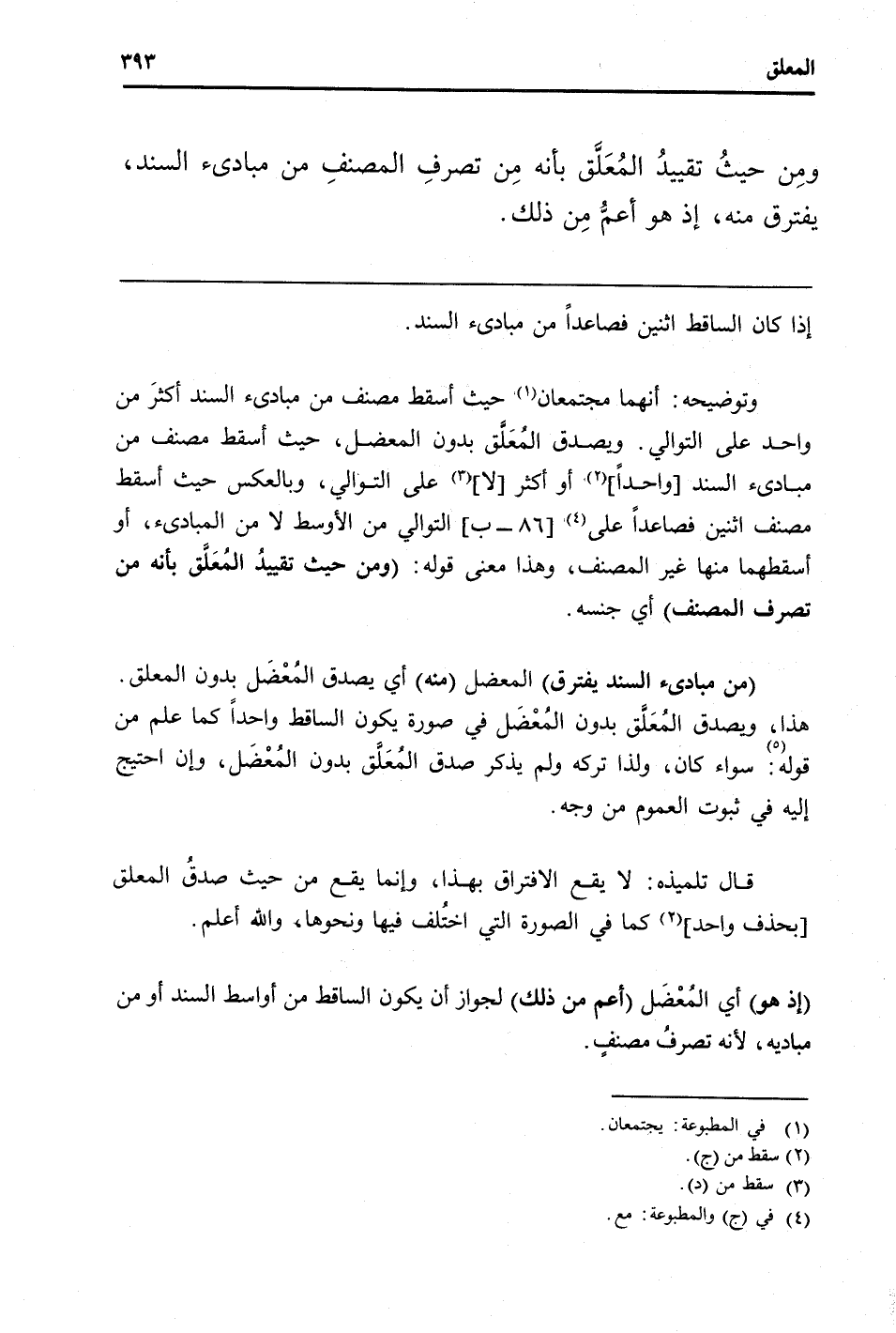 (من مبادئ السَّنَد يفْتَرق) المعضل (مِنْهُ) أَي يصدق المُعْضَل بِدُونِ الْمُعَلق هَذَا وَيصدق المُعلق بِدُونِ المُعْضَل فِي صُورَة يكون السَّاقِط وَاحِدًا كَمَا علم من قَوْله: سَوَاء كَانَ، وَلذَا تَركه وَلم يذكر صدق المُعلق بِدُونِ المُعْضَل، وَإِن احْتِيجَ إِلَيْهِ فِي ثُبُوت الْعُمُوم من وَجه.