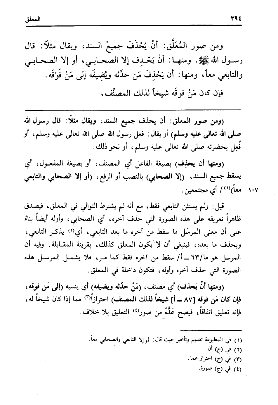 (وَمِنْهَا أَن يحذِف) بِصِيغَة الْفَاعِل أَي المُصَنّف، أَو بِصِيغَة الْمَفْعُول، أَي يسْقط جَمِيع السَّنَد، (إِلَّا الصَّحَابِيّ) بِالنّصب أَو الرّفْع، (أَو إِلَّا الصَّحَابِيّ والتابعي مَعًا) / أَي مُجْتَمعين.