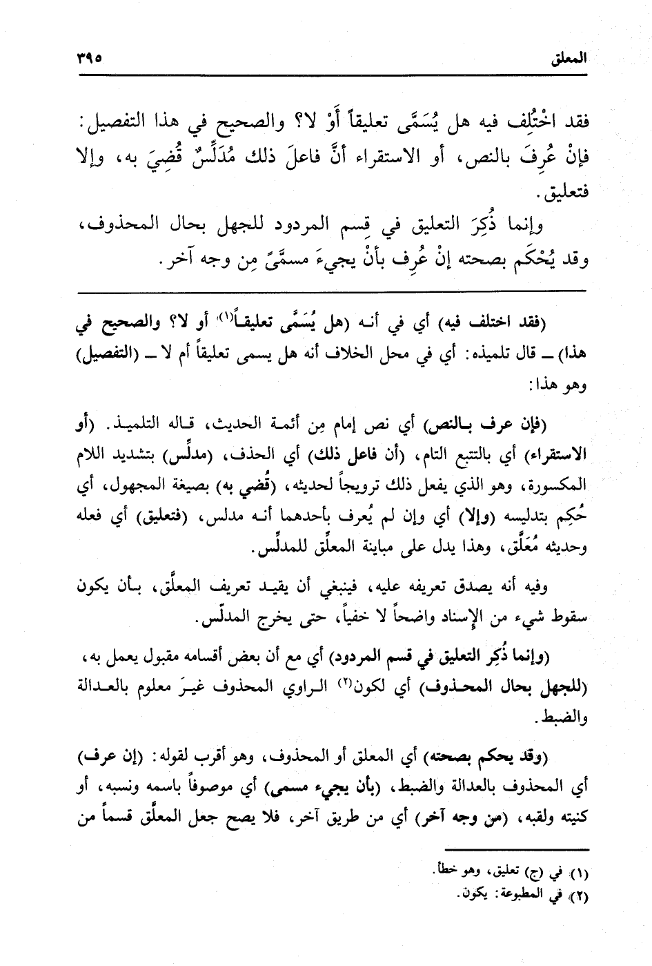 (فقد اخْتلف فِيهِ) أَي فِي أَنه (هَل يُسَمى تَعْلِيقا أَو لَا؟ وَالصَّحِيح فِي هَذَا) - قَالَ تِلْمِيذه: أَي فِي مَحل الْخلاف أَنه هَل يُسمى تَعْلِيقا أم لَا - (التَّفْصِيل) وَهُوَ هَذَا: