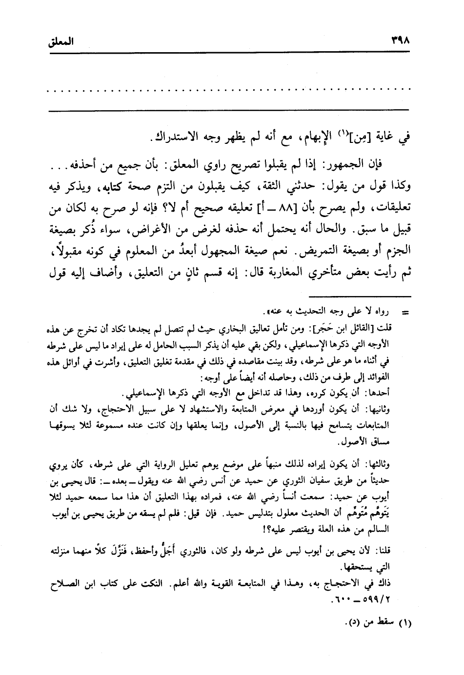 فَإِن الْجُمْهُور: إِذا لم يقبلُوا تَصْرِيح رَاوِي الْمُعَلق: بِأَن جَمِيع من أحذفه ... وَكَذَا قَول من يَقُول: حَدثنِي الثِّقَة، كَيفَ يقبلُونَ من الْتزم صِحَة كِتَابه، وَيذكر فِيهِ تعليقات، وَلم يُصَرح بِأَن [88 - أ] تَعْلِيقه صَحِيح أم لَا؟ فَإِنَّهُ لَو صرح بِهِ لَكَانَ من قبيل مَا سبق. وَالْحَال أَنه يحْتَمل أَنه حذفه لغَرَض من الْأَغْرَاض، سَوَاء ذُكر بِصِيغَة الْجَزْم أَو بِصِيغَة التمريض. نعم صِيغَة الْمَجْهُول أبعدُ من الْمَعْلُوم فِي كَونه مَقْبُولًا ثمَّ رَأَيْت بعض متأخري المغاربة قَالَ: إِنَّه قسم ثانٍ من التَّعْلِيق، وأضاف إِلَيْهِ قَول