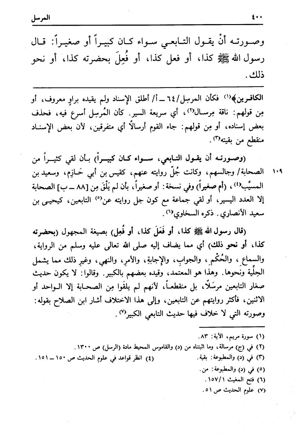 الْكَافرين} فَكَأَن المرسِل / 64 - أ / أطلق الْإِسْنَاد وَلم يُقَيِّدهُ براوٍ مَعْرُوف، أَو مِن قَوْلهم: نَاقَة مِرسال، أَي سريعة السّير. كَأَن المُرسل أسْرع فِيهِ، فَحذف بعض إِسْنَاده، أَو من قَوْلهم: جَاءَ الْقَوْم أَرْسَالًا أَي مُتَفَرّقين، لِأَن بعض الإٍ سناد مُنْقَطع من بَقِيَّته.