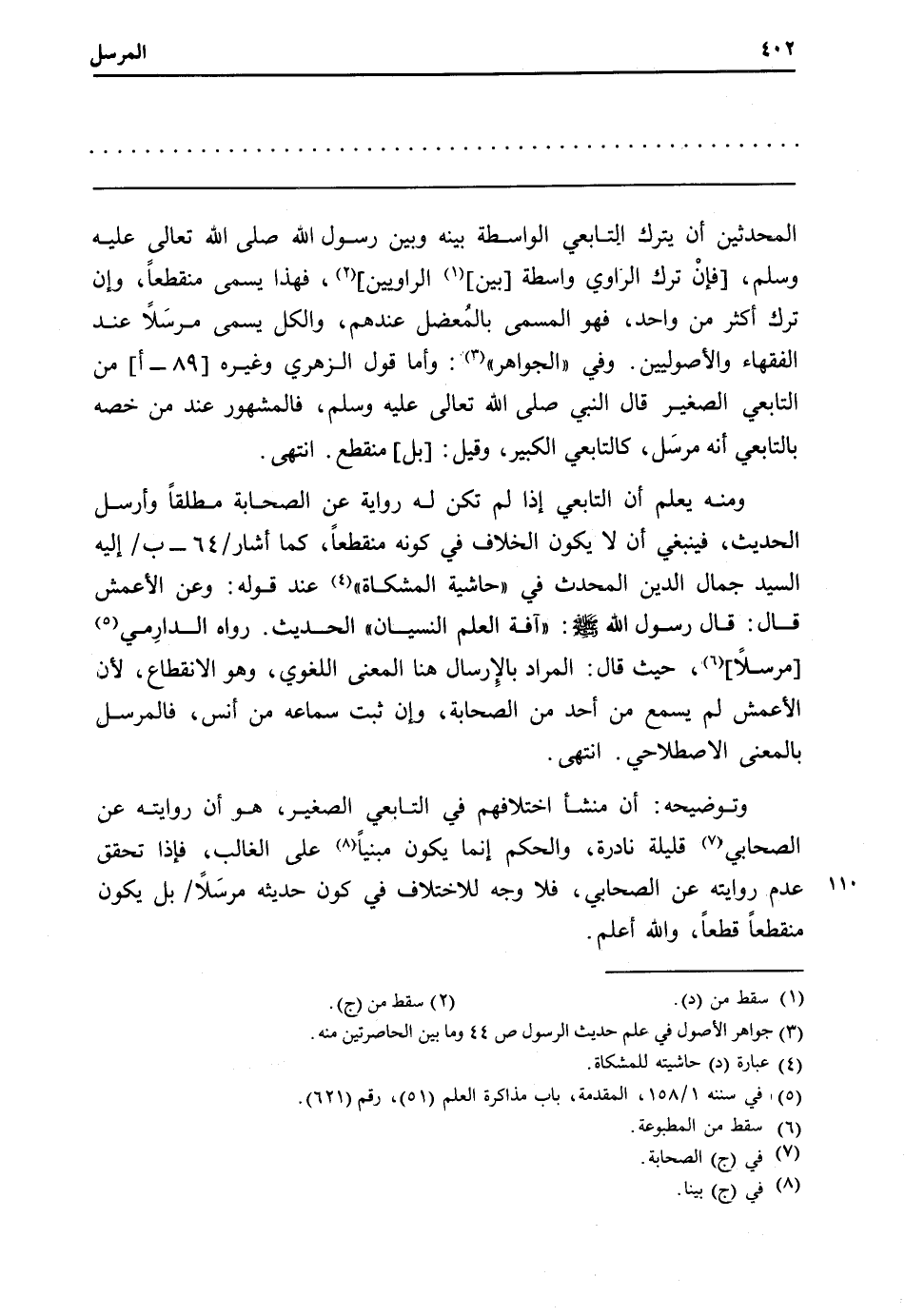 الْمُحدثين أَن يتْرك التَّابِعِيّ الْوَاسِطَة بَينه وَبَين رَسُول الله تَعَالَى عَلَيْهِ وَسلم، [فَإِن ترك الرَّاوِي وَاسِطَة بَين الراويين] ، فَهَذَا يُسمى مُنْقَطِعًا، وَإِن ترك أَكثر من وَاحِد، فَهُوَ الْمُسَمّى بالمُعضل عِنْدهم، وَالْكل يُسمى مُرْسلا عِنْد الْفُقَهَاء والأصوليين. وَفِي " الْجَوَاهِر ": وَأما قَول الزُّهْرِيّ وَغَيره [89 - أ] من التَّابِعِيّ الصَّغِير قَالَ النَّبِي صلى الله تَعَالَى عَلَيْهِ وَسلم، فَالْمَشْهُور عِنْد من خصّه بالتابعي أَنه مرسَل كالتابعي الْكَبِير، وَقيل: [بل] مُنْقَطع. انْتهى.