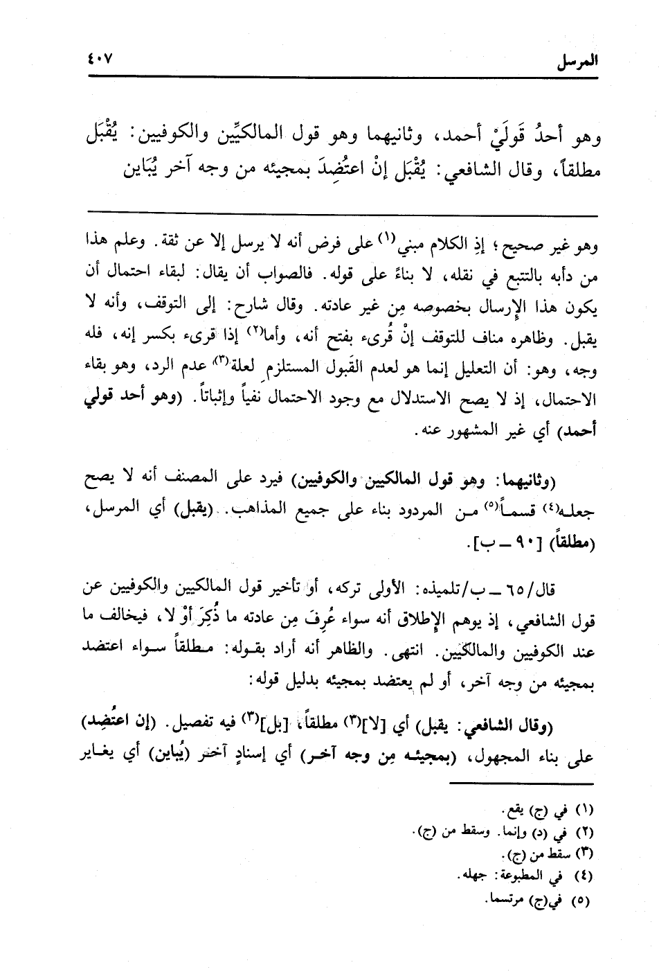 وَهُوَ غير صَحِيح؛ إِذْ الْكَلَام مَبْنِيّ على فرض أَنه لَا يُرْسل إِلَّا عَن ثِقَة. وَعلم هَذَا من دأبه بالتتبع فِي نَقله، لَا بِنَاء على قَوْله. فَالصَّوَاب أَن يُقَال: لبَقَاء احْتِمَال أَن يكون هَذَا الْإِرْسَال بِخُصُوصِهِ من غير عَادَته. وَقَالَ شَارِح: إِلَى التَّوَقُّف، وَأَنه لَا يقبل. وَظَاهره منَاف للتوقف إنْ قُرئ بِفَتْح أَنه، وَأما إِذا قرئَ بِكَسْر إِنَّه، فَلهُ وَجه، وَهُوَ: أَن التَّعْلِيل إِنَّمَا هُوَ لعدم الْقبُول المستلزم لعِلَّة عدم الرَّد، وَهُوَ بَقَاء الِاحْتِمَال، إِذْ لَا يَصح الِاسْتِدْلَال مَعَ وجود الِاحْتِمَال نفيا وإثباتاً. (وَهُوَ أحد قولي أَحْمد) أَي غير الْمَشْهُور عَنهُ.