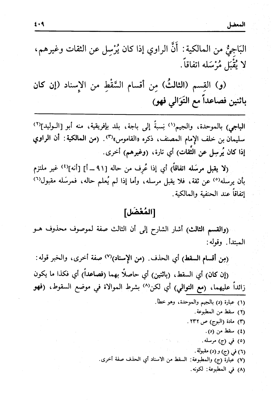 الْبَاجِيّ) بِالْمُوَحَّدَةِ، وَالْجِيم نِسْبَة إِلَى باجة، بلد بإفريقية، مِنْهُ أَبُو [الْوَلِيد] سُلَيْمَان بن خلف الإِمَام المُصَنّف، ذكره " الْقَامُوس ". (من الْمَالِكِيَّة: أَن الرَّاوِي إِذا كَانَ يُرْسل عَن الثِّقَات) أَي تَارَة، (وَغَيرهم) أُخْرَى.