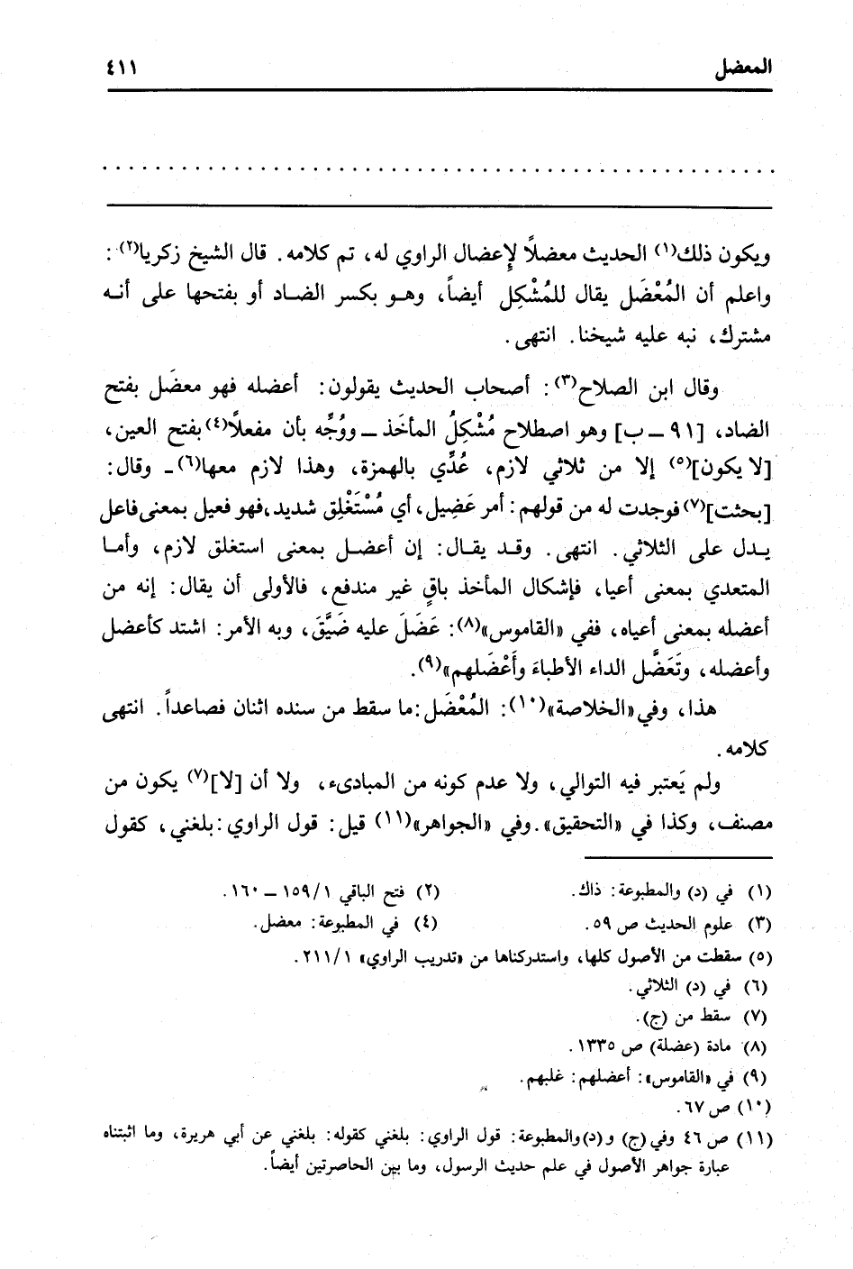 وَقَالَ ابْن الصّلاح: أَصْحَاب الحَدِيث يَقُولُونَ: أعضله فَهُوَ معضل بِفَتْح الضَّاد، [91 - ب] وَهُوَ اصْطِلَاح مُشكل المأخذ - وَوجه بِأَن مفعلا بِفَتْح الْعين، [لَا يكون] إِلَّا من ثلاثي لَازم، عدي بِالْهَمْزَةِ، وَهَذَا لَازم مَعهَا - وَقَالَ: [بحثت] فَوجدت لَهُ من قَوْلهم: أَمر عضيل، أَي مستغلق شَدِيد، فَهُوَ فعيل بِمَعْنى فَاعل يدل على الثلاثي. انْتهى. وَقد يُقَال: إِن أعضل بِمَعْنى استغلق لَازم، وَأما الْمُتَعَدِّي بِمَعْنى أعيا، فإشكال المأخذ بَاقٍ غير مندفع، فَالْأولى أَن يُقَال: إِنَّه من أعضله بِمَعْنى أعياه، فَفِي " الْقَامُوس ": عضل عَلَيْهِ ضيق، وَبِه الْأَمر: اشْتَدَّ كأعضل وأعضله، وتعضل الدَّاء الْأَطِبَّاء وأعضلهم ".