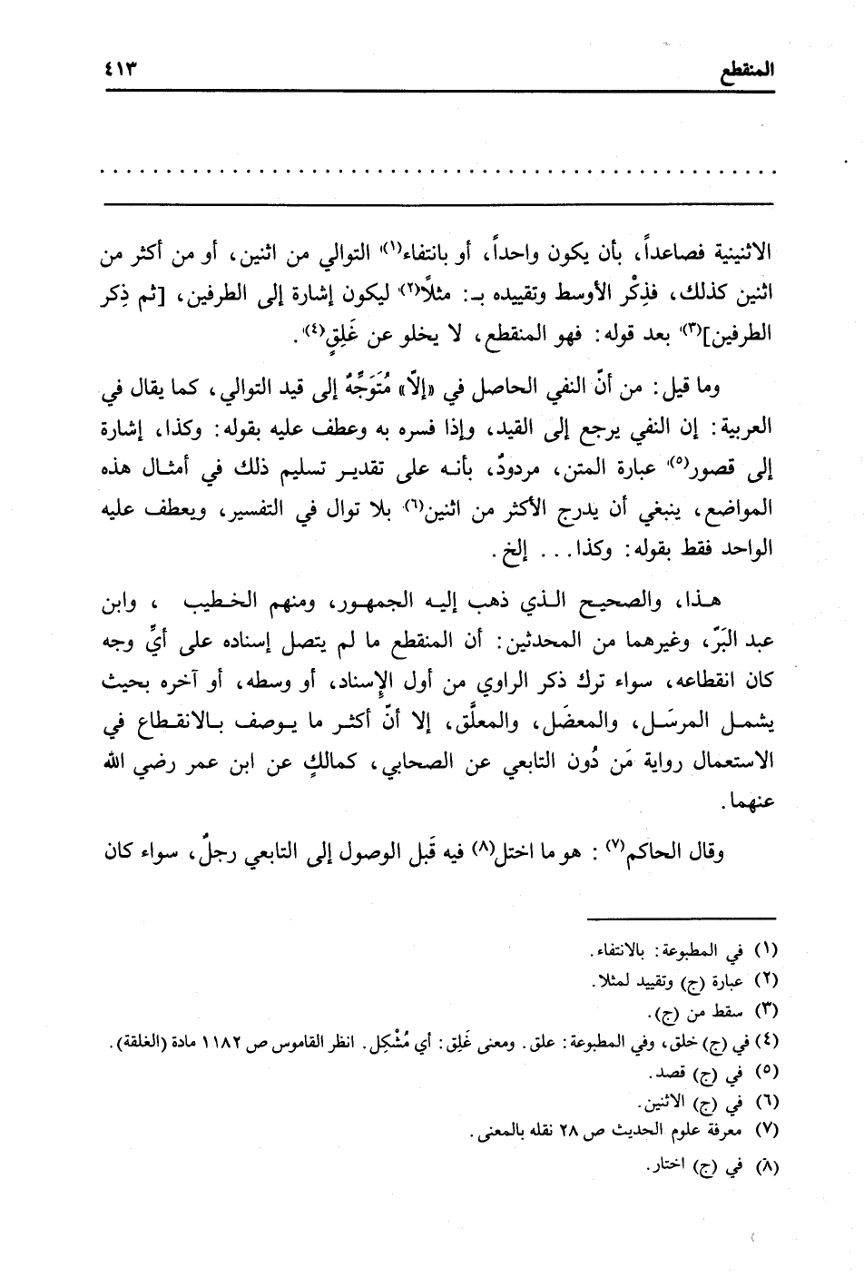 هَذَا، وَالصَّحِيح الَّذِي ذهب إِلَيْهِ الْجُمْهُور، وَمِنْهُم الْخَطِيب، وَابْن عبد الْبر، وَغَيرهمَا من الْمُحدثين: أَن الْمُنْقَطع مَا لم يتَّصل إِسْنَاده على أَي وَجه كَانَ انْقِطَاعه، سَوَاء ترك ذكر الرَّاوِي من أول الْإِسْنَاد، أَو وَسطه، أَو آخِره بِحَيْثُ يَشْمَل الْمُرْسل، والمعضل، وَالْمُعَلّق، إِلَّا أَن أَكثر مَا يُوصف بالانقطاع فِي الِاسْتِعْمَال رِوَايَة من دون التَّابِعِيّ عَن الصَّحَابِيّ، كمالك عَن ابْن عمر رَضِي الله عَنْهُمَا.