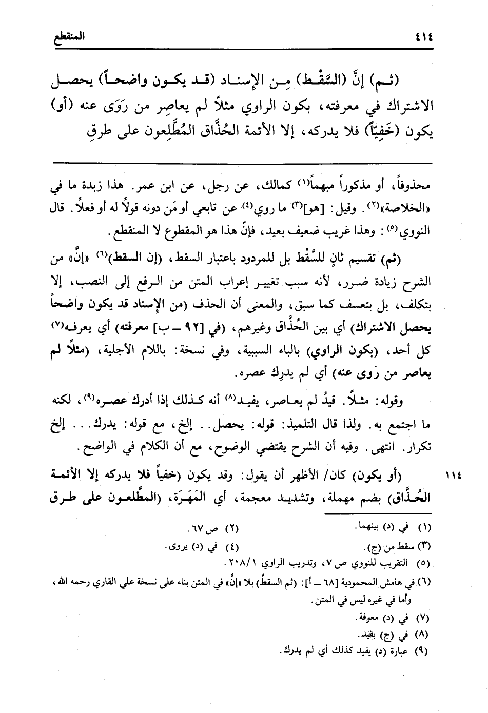 (ثمَّ) تَقْسِيم ثانٍ للسقط بل للمردود بِاعْتِبَار الْقسْط، (إِن الْقسْط) " إِن " من الشَّرْح زِيَادَة ضَرَر، لِأَنَّهُ سَبَب تَغْيِير إِعْرَاب الْمَتْن من الرّفْع إِلَى النصب، إِلَّا بتكلف، بل بتعسف كَمَا سبق، وَالْمعْنَى أَن الْحَذف (من الْإِسْنَاد قد يكون وَاضحا يحصل الِاشْتِرَاك) أَي بَين الحذاق وَغَيرهم، (فِي [92 - ب] مَعْرفَته) أَي يعرفهُ كل أحد، (بِكَوْن الرَّاوِي) بِالْبَاء السببيه، وَفِي نُسْخَة: بِاللَّامِ الأجلية، (مثلا لم يعاصر من روى عَنهُ) أَي لم يدْرك عصره.