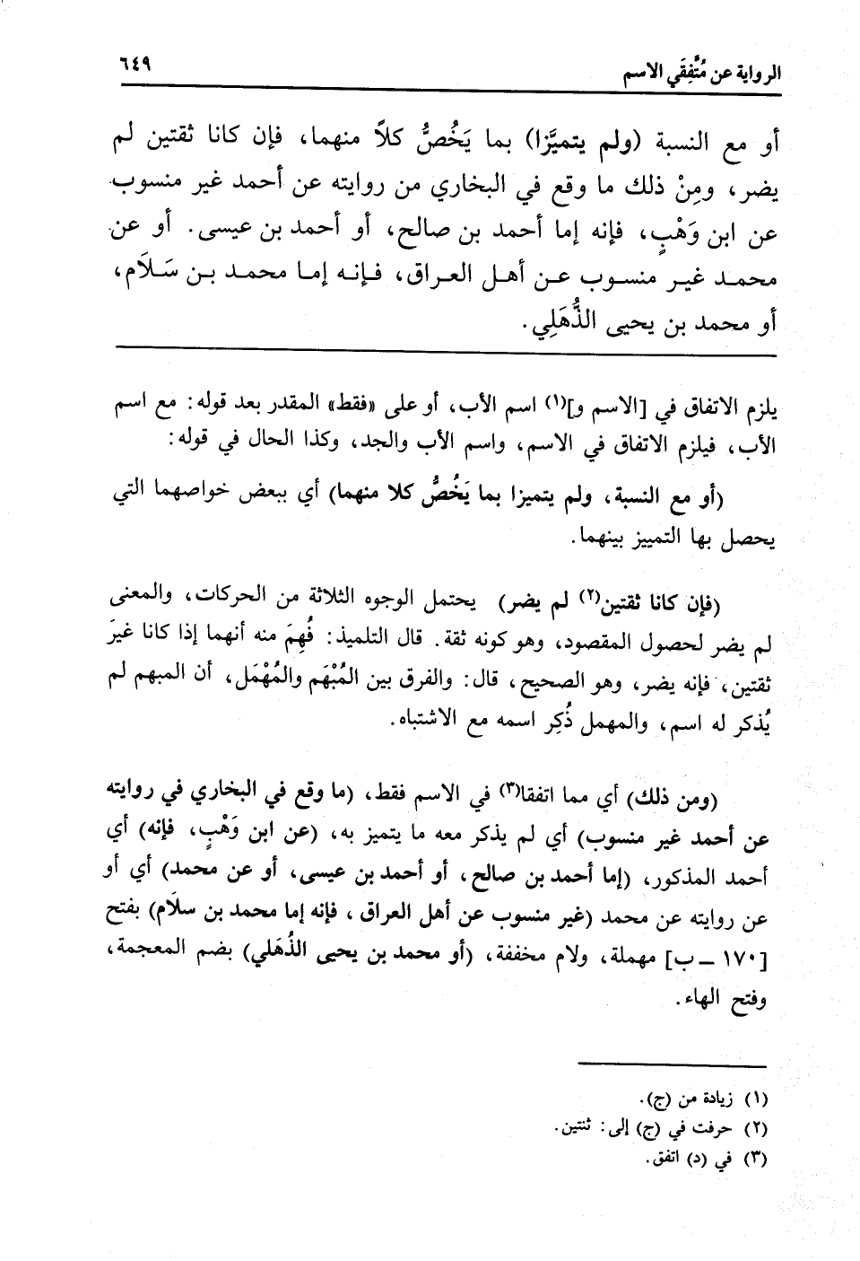 (وَمن ذَلِك) أَي مِمَّا اتفقَا فِي الِاسْم فَقَط، (مَا وَقع فِي البُخَارِيّ فِي رِوَايَته عَن أَحْمد غير مَنْسُوب) أَي لم يذكر مَعَه مَا يتَمَيَّز بِهِ، (عَن ابْن وَهْب، فَإِنَّهُ) أَي أَحْمد الْمَذْكُور، (إِمَّا أَحْمد بن صَالح، أَو أَحْمد بن عِيسَى، أَو عَن مُحَمَّد) أَي أَو عَن رِوَايَته عَن مُحَمَّد (غير مَنْسُوب عَن أهل الْعرَاق، فَإِنَّهُ إِمَّا مُحَمَّد بن سَلام) بِفَتْح [170 - ب] مُهْملَة، وَلَام مُخَفّفَة، (أَو مُحَمَّد بن يحيى الذُّهَلي) بِضَم الْمُعْجَمَة، وَفتح الْهَاء.