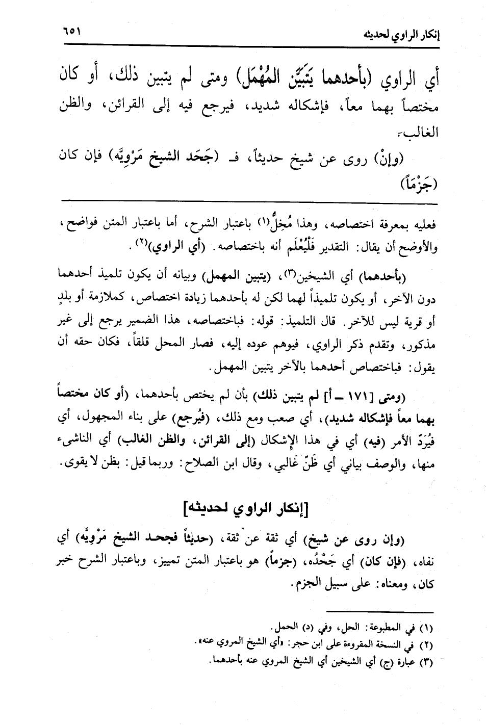 (وَإِن روى عَن شيخ) أَي ثِقَة عَن ثِقَة، (حَدِيثا فَجحد الشَّيْخ مَرْوية) أَي نَفَاهُ، (فَإِن كَانَ) أَي جحدُه، (جزما) هُوَ بِاعْتِبَار الْمَتْن تَمْيِيز، وَبِاعْتِبَار الشَّرْح خبر كَانَ، وَمَعْنَاهُ: على سَبِيل الْجَزْم.