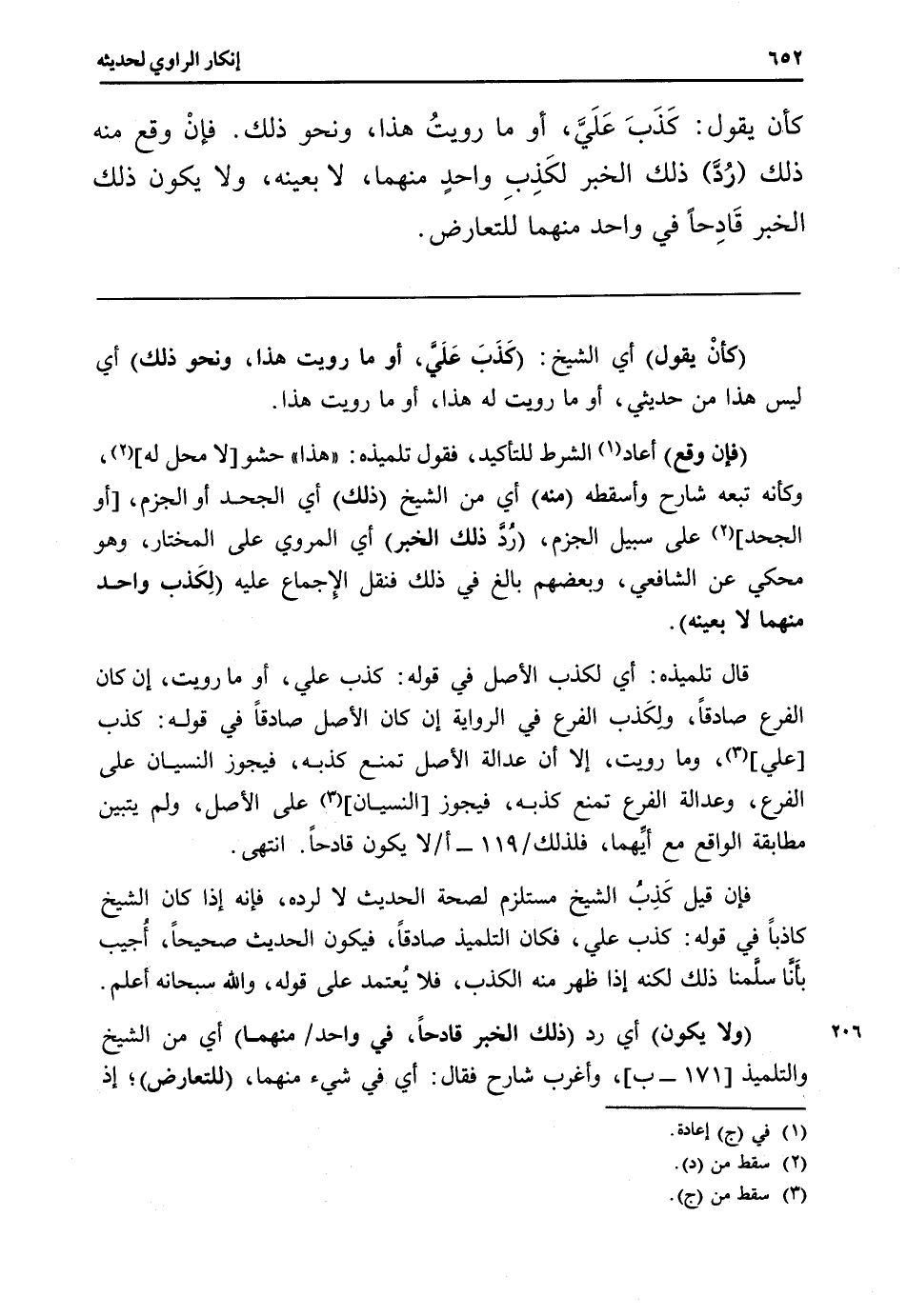 (كأنْ يَقُول) أَي الشَّيْخ: (كذب عليَّ، أَو مَا رويت هَذَا، وَنَحْو ذَلِك) أَي لَيْسَ هَذَا من حَدِيثي، أَو مَا رويت لَهُ هَذَا، أَو مَا رويت هَذَا.