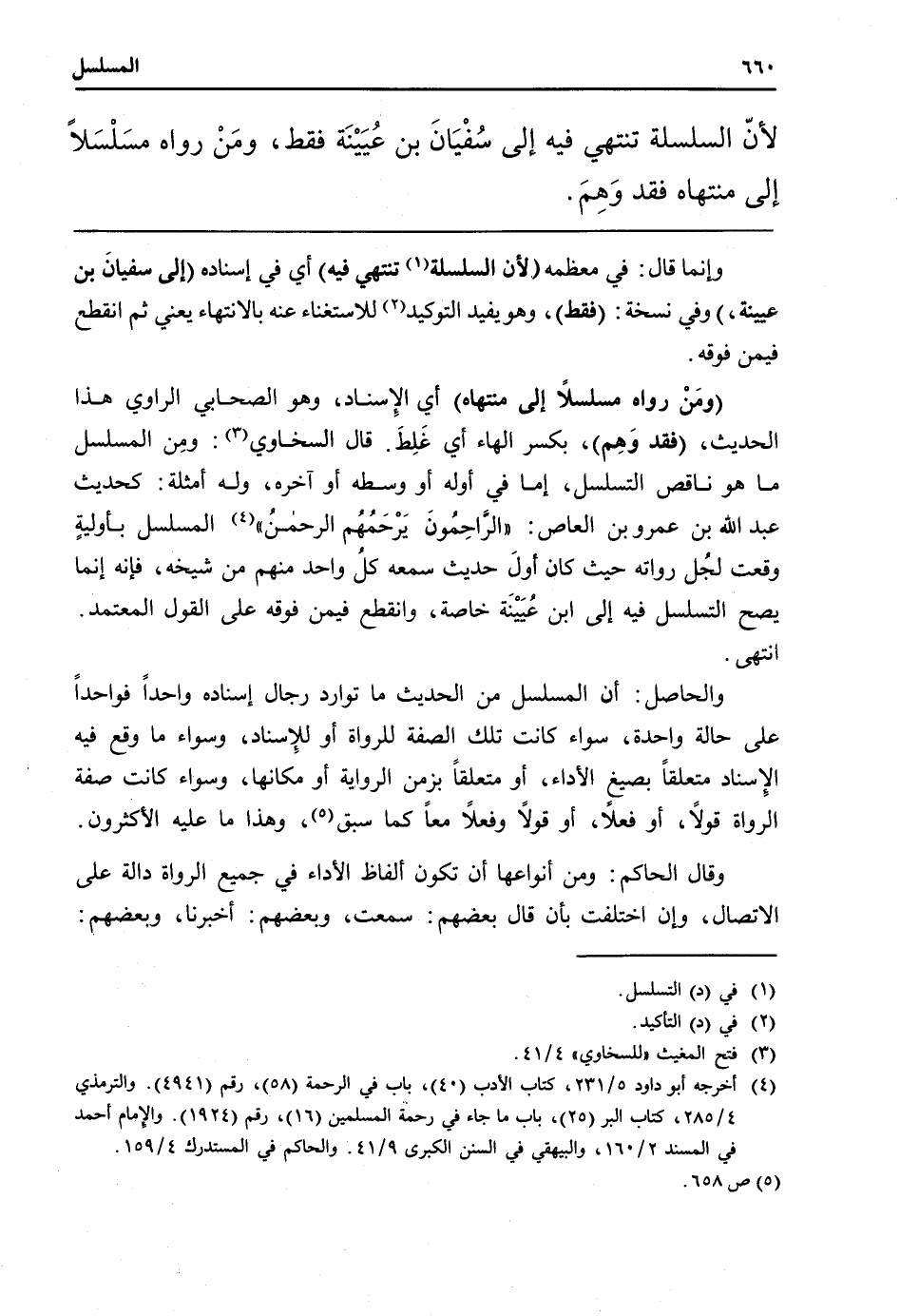 وَالْحَاصِل: أَن المسلسل من الحَدِيث مَا توارد رجال إِسْنَاده وَاحِدًا فواحدا على حَالَة وَاحِدَة، سَوَاء كَانَت تِلْكَ الصّفة للرواة أَو للإسناد، وَسَوَاء مَا وَقع فِيهِ الْإِسْنَاد مُتَعَلقا بصيغ الْأَدَاء، أَو مُتَعَلقا بِزَمن الرِّوَايَة أَو مَكَانهَا، وَسَوَاء كَانَت صفة الروَاة قولا، أَو فعلا، أَو قولا وفعلا مَعًا كَمَا سبق، وَهَذَا مَا عَلَيْهِ الْأَكْثَرُونَ.
