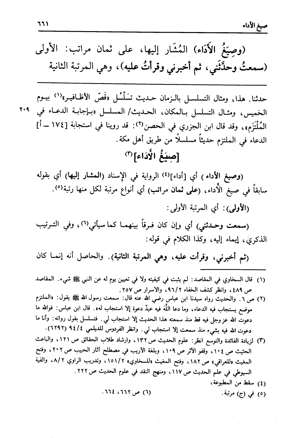 (وصيغ الْأَدَاء) أَي [أَدَاء] الرِّوَايَة فِي الْإِسْنَاد (الْمشَار إِلَيْهَا) أَي بقوله سَابِقًا فِي صِيغ الْأَدَاء، (على ثَمَان مَرَاتِب) أَي أَنْوَاع مرتبَة لكل مِنْهَا رُتْبَة.