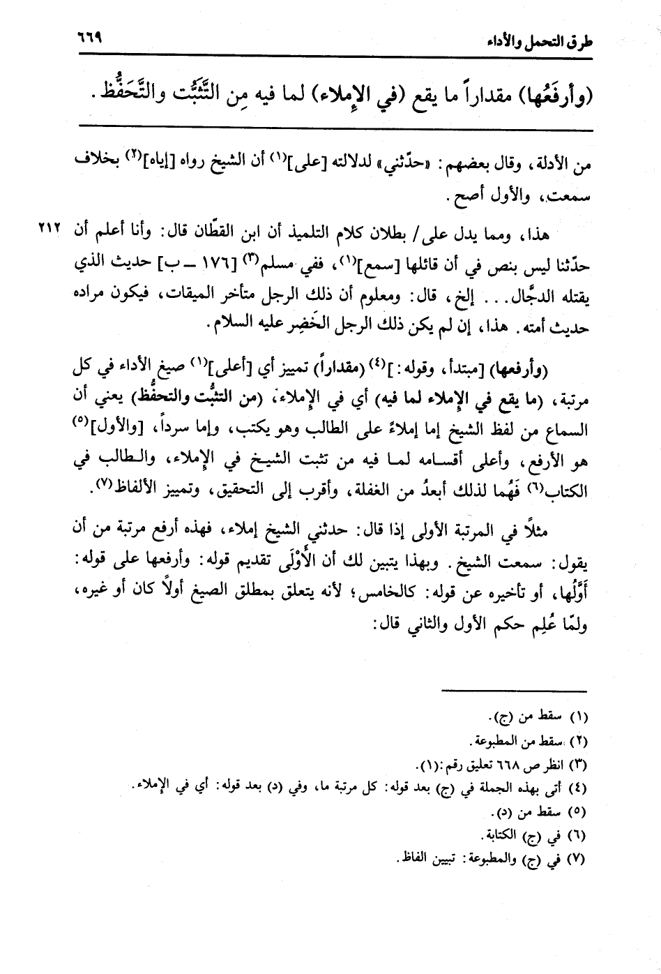 مثلا فِي الْمرتبَة الأولى إِذا قَالَ: حَدثنِي الشَّيْخ إملاء، فَهَذِهِ أرفع مرتبَة من أَن يَقُول: سَمِعت الشَّيْخ. وَبِهَذَا يتَبَيَّن لَك أَن الأولى تَقْدِيم قَوْله: وأرفعها على قَوْله: أَوَّلُها، أَو تَأْخِيره عَن قَوْله: كالخامس؛ لِأَنَّهُ يتَعَلَّق بِمُطلق الصِّيَغ أَولا كَانَ أَو غَيره، ولَمّا عُلِم حكم الأول وَالثَّانِي قَالَ: