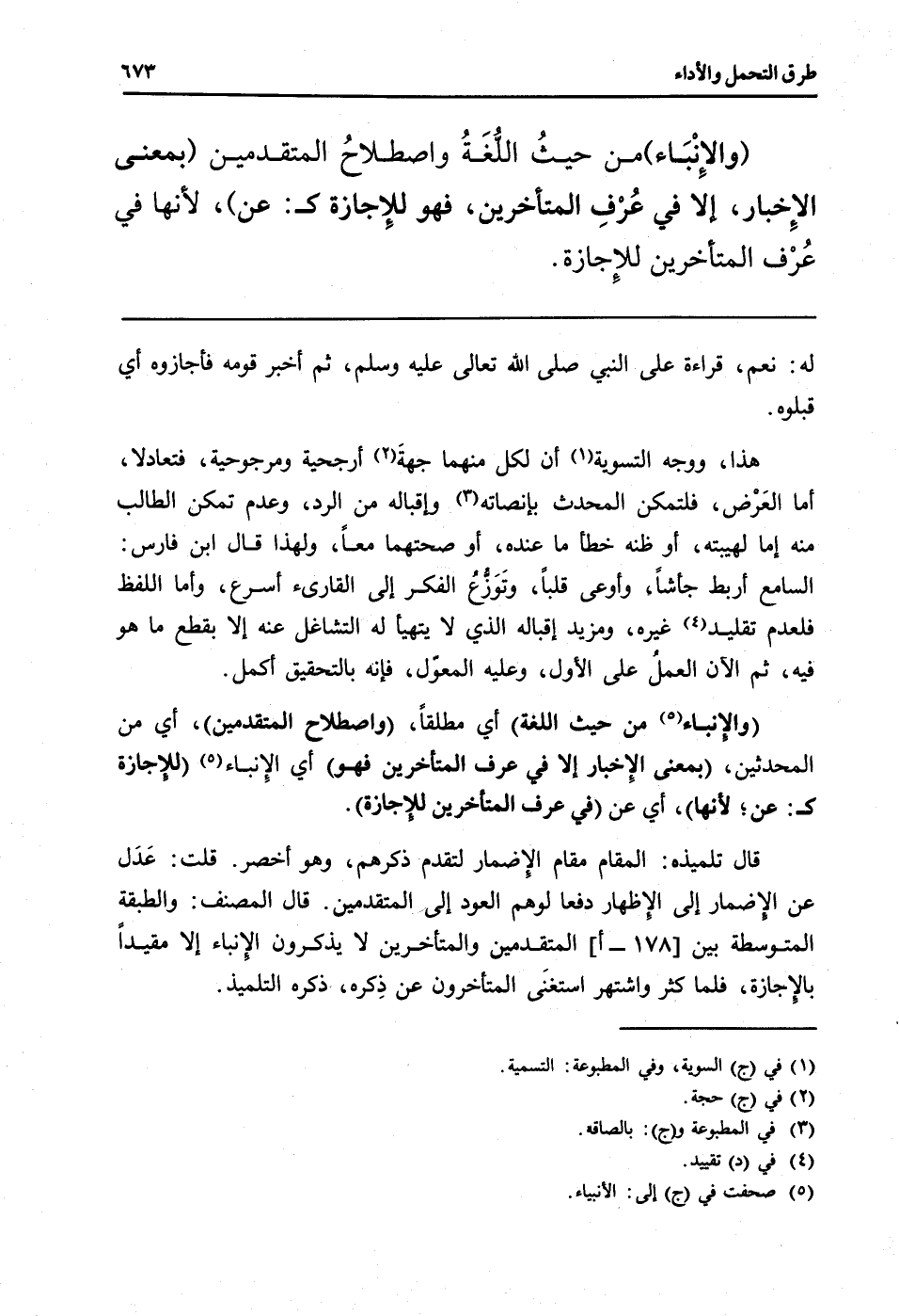 (والإنباء من حَيْثُ اللُّغَة) أَي مُطلقًا، (واصطلاح الْمُتَقَدِّمين) ، أَي من الْمُحدثين، (بِمَعْنى الْإِخْبَار إِلَّا فِي عرف الْمُتَأَخِّرين فَهُوَ) أَي الإنباء (للإجازة ك: عَن؛ لِأَنَّهَا) ، أَي عَن (فِي عرف الْمُتَأَخِّرين للإجازة) .
