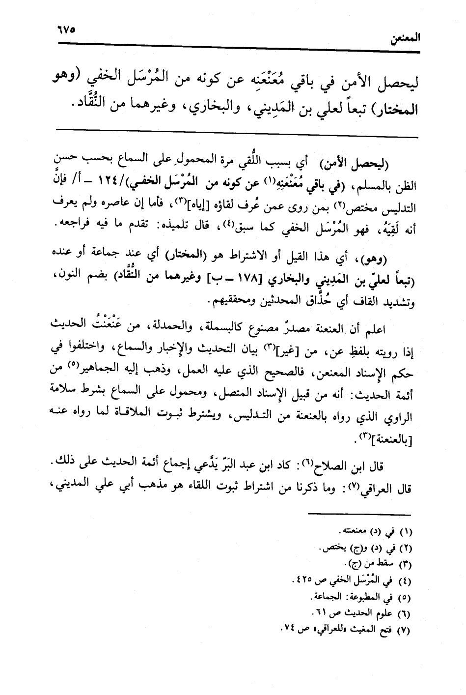 اعْلَم أَن العنعنة مصدر مَصْنُوع كالبسملة، والحمدلة، من عَنْعَنْتُ الحَدِيث إِذا رويته بلفظِ عَن، من [غير] بَيَان التحديث والإخبار وَالسَّمَاع، وَاخْتلفُوا فِي حكم الْإِسْنَاد المعنعن، فَالصَّحِيح الَّذِي عَلَيْهِ الْعَمَل، وَذهب إِلَيْهِ الجماهير من أَئِمَّة الحَدِيث: أَنه من قبيل الْإِسْنَاد الْمُتَّصِل، ومحمول على السماع بِشَرْط سَلامَة الرَّاوِي الَّذِي رَوَاهُ بالعنعنة من التَّدْلِيس، وَيشْتَرط ثُبُوت الملاقاة لما رَوَاهُ عَنهُ [بالعنعنة] .