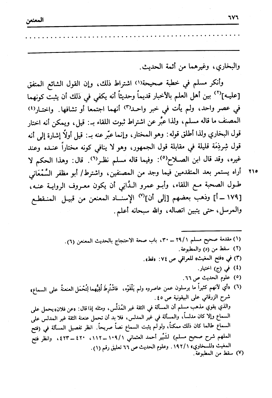 وَأنكر مُسلم فِي خطْبَة صَحِيحَة اشْتِرَاط ذَلِك، وَإِن القَوْل الشَّائِع الْمُتَّفق [عَلَيْهِ] بَين أهل الْعلم بالأخبار قَدِيما وحديثاً أَنه يَكْفِي فِي ذَلِك أَن يثبت كَونهمَا فِي عصر وَاحِد، وَلم يَأْتِ فِي خبر وَاحِد أَنَّهُمَا اجْتمعَا أَو تشافها. وَاخْتَارَ المُصَنّف مَا قَالَه مُسلم، وَلذَا عبَّر عَن اشْتِرَاط ثُبُوت اللِّقَاء ب: قيل، وَيُمكن أَنه اخْتَار قَول البُخَارِيّ وَلذَا أطلق قَوْله: وَهُوَ الْمُخْتَار، وَإِنَّمَا عبّر عَنهُ ب: قيل أَولا إِشَارَة إِلَى أَنه قَول شِرذَمَة قَليلَة فِي مُقَابلَة قَول الْجُمْهُور، وَهُوَ لَا يُنَافِي كَونه مُخْتَارًا عِنْده وَعند غَيره، وَقد قَالَ ابْن الصّلاح: وَفِيمَا قَالَه مُسلم نظر. قَالَ: وَهَذَا الحكم لَا أرَاهُ يسْتَمر بعد الْمُتَقَدِّمين فِيمَا وجد من المصنفين، وَاشْتِرَاط / أَبُو مظفر السَّمْعَاني طول الصُّحْبَة مَعَ اللِّقَاء، وَأَبُو عَمْرو الدَّاني أَن يكون مَعْرُوف الرِّوَايَة عَنهُ، [179 - أ] وَذهب بَعضهم [إِلَى أَن] الْإِسْنَاد المعنعن من قبيل الْمُنْقَطع والمرسل، حَتَّى يتَبَيَّن اتِّصَاله، وَالله سُبْحَانَهُ أعلم.