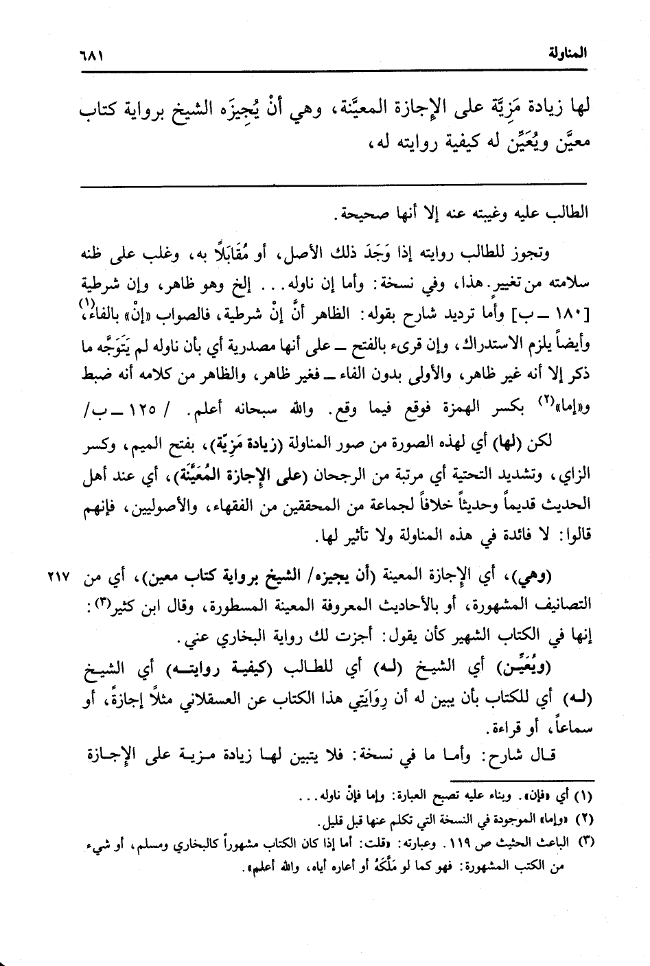 وَتجوز للطَّالِب رِوَايَته إِذا وَجَدَ ذَلِك الأَصْل، أَو مُقَابَلاً بِهِ، وَغلب على ظَنّه سَلَامَته من تَغْيِير. هَذَا، وَفِي نُسْخَة: وَأما إِن نَاوَلَهُ ... الخ وَهُوَ ظَاهر، وَإِن شَرْطِيَّة [180 - ب] وَأما ترديد شَارِح بقوله: الظَّاهِر أنَّ إنْ شَرْطِيَّة، فَالصَّوَاب " إِن " بِالْفَاءِ، وَأَيْضًا يلْزم الِاسْتِدْرَاك، وَإِن قرئَ بِالْفَتْح - على أَنَّهَا مَصْدَرِيَّة أَي بِأَن نَاوَلَهُ لم يَتَوجه مَا ذكر إِلَّا أَنه غير ظَاهر، وَالْأولَى بِدُونِ الْفَاء - فَغير ظَاهر، وَالظَّاهِر من كَلَامه أَنه ضبط و " إِمَّا " بِكَسْر الْهمزَة فَوَقع فِيمَا وَقع. وَالله سُبْحَانَهُ أعلم. / 125 - ب /