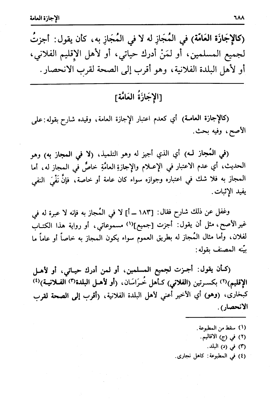 (كَأَن يَقُول: أجزت لجَمِيع الْمُسلمين، أَو لمن أدْرك حَياتِي، أَو لأهل الإقليم) بكسرتين (الْفُلَانِيّ) كَأَهل خُرَاسَان، (أَو لأهل الْبَلدة الْفُلَانِيَّة) كبخارى، (وَهُوَ) أَي الْأَخير أَعنِي لأهل الْبَلدة الْفُلَانِيَّة، (أقرب إِلَى الصِّحَّة لقرب الانحصار) .