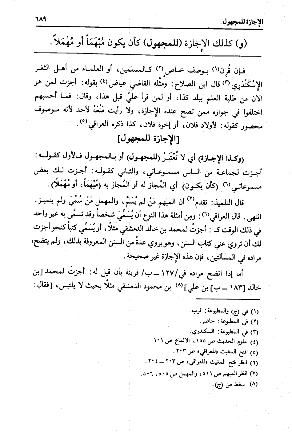 (وَكَذَا الْإِجَازَة) أَي لَا تُعْتَبرُ (للْمَجْهُول) أَو بِالْمَجْهُولِ فَالْأول كَقَوْلِه: أجزت لجَماعَة من النَّاس مسموعاتي، وَالثَّانِي كَقَوْلِه: أجزت لَك بعض مسموعاتي (كَأَن يكون) أَي المُجاز لَهُ أَو الْمجَاز بِهِ (مُبْهَمَاً، أَو مُهْمَلاً)