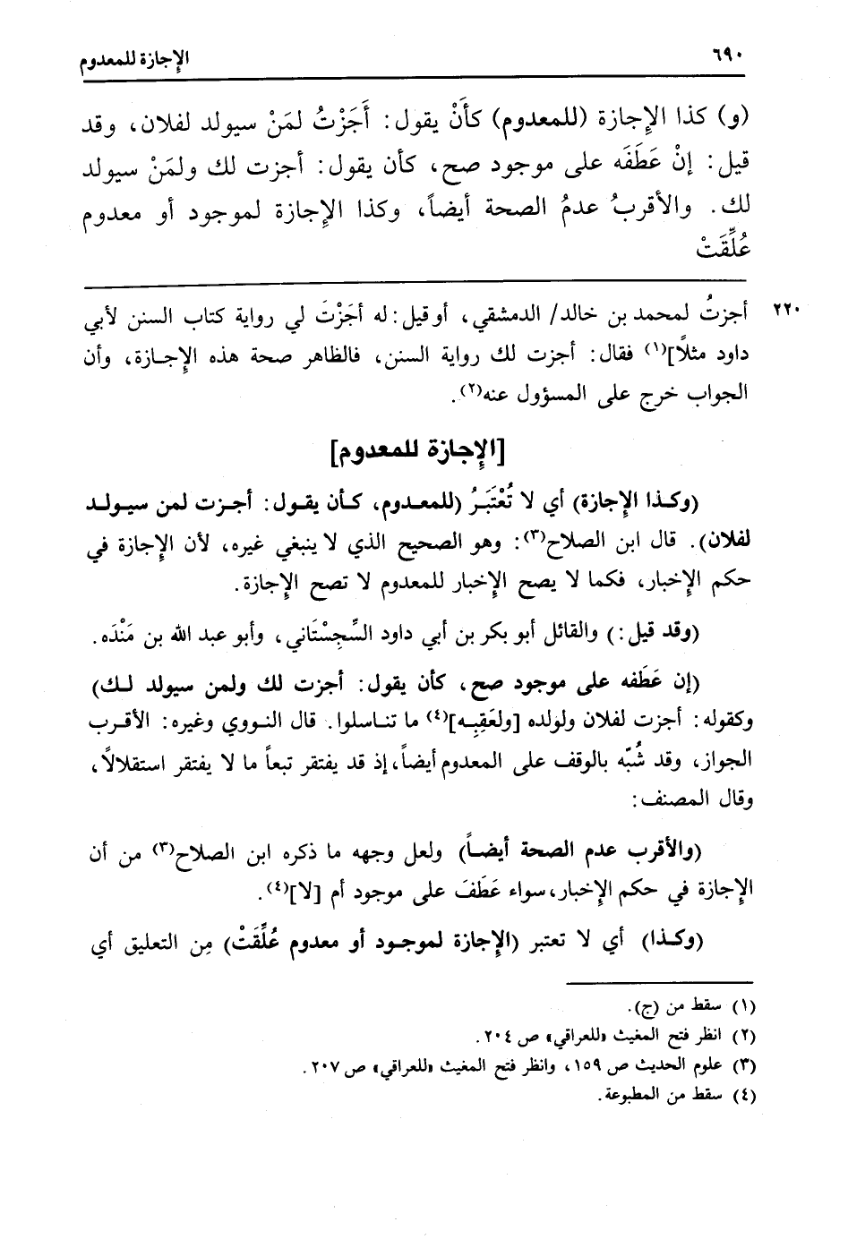 (وَكَذَا الْإِجَازَة) أَي لَا تعْتَبر (للمعدوم، كَأَن يَقُول: أجزت لمن سيولد لفُلَان) . قَالَ ابْن الصّلاح: وَهُوَ الصَّحِيح الَّذِي لَا يَنْبَغِي غَيره، لِأَن الْإِجَازَة فِي حكم الْإِخْبَار، فَكَمَا لَا يَصح الْإِخْبَار للمعدوم لَا تصح الْإِجَازَة.