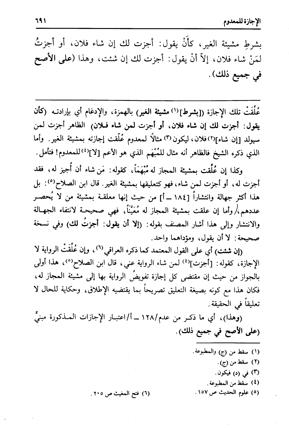 علقت تِلْكَ الْإِجَازَة ( [بِشَرْط] مَشِيئَة الْغَيْر) بِالْهَمْزَةِ، والإدغام أَي بإرادته (كَأَن يَقُول: أجرت لَك إِن شَاءَ فلَان، أَو أجرت لمن شَاءَ فلَان) الظَّاهِر أجرت لمن سيولد [إِن شَاءَ] فلَان، ليَكُون مِثَالا لمعدوم علقت إِجَازَته بِمَشِيئَة الْغَيْر. وَأما الَّذِي ذكره الشَّيْخ فَالظَّاهِر أَنه مِثَال للمبهم الَّذِي هُوَ الْأَعَمّ [لَا] للمعدوم! فَتَأمل.