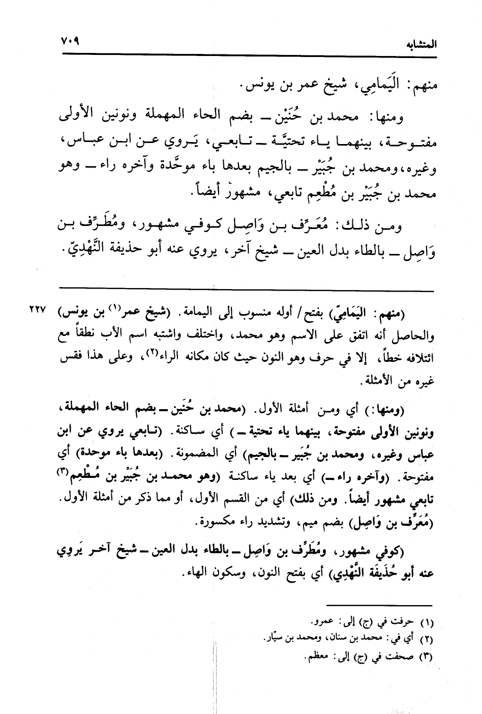 (مِنْهُم: اليَمَاميّ) بِفَتْح / أَوله مَنْسُوب إِلَى الْيَمَامَة. (شيخ عمر بن يُونُس) وَالْحَاصِل أَنه اتّفق على الِاسْم وَهُوَ مُحَمَّد، وَاخْتلف واشتبه اسْم الْأَب نطقاً مَعَ ائتلافه خطا، إِلَّا فِي حرف وَهُوَ النُّون حَيْثُ كَانَ مَكَانَهُ الرَّاء، وعَلى هَذَا فقس غَيره من الْأَمْثِلَة.