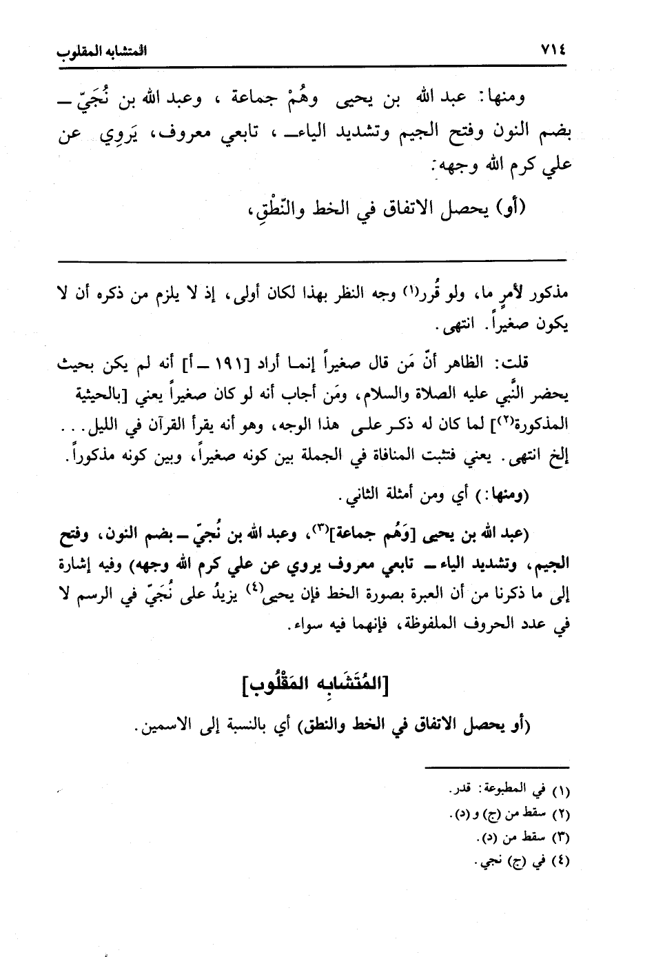 (عبد الله بن يحيى [وَهُم جمَاعَة] ، وَعبد الله بن نُجيّ - بِضَم النُّون، وَفتح الْجِيم، وَتَشْديد الْيَاء - تَابِعِيّ مَعْرُوف يروي عَن عَليّ كرم الله وَجهه) وَفِيه إِشَارَة إِلَى مَا ذكرنَا من أَن الْعبْرَة بِصُورَة الْخط فَإِن يحيى يزيدُ على نُجَيّ فِي الرَّسْم لَا فِي عدد الْحُرُوف الملفوظة، فَإِنَّهُمَا فِيهِ سَوَاء.