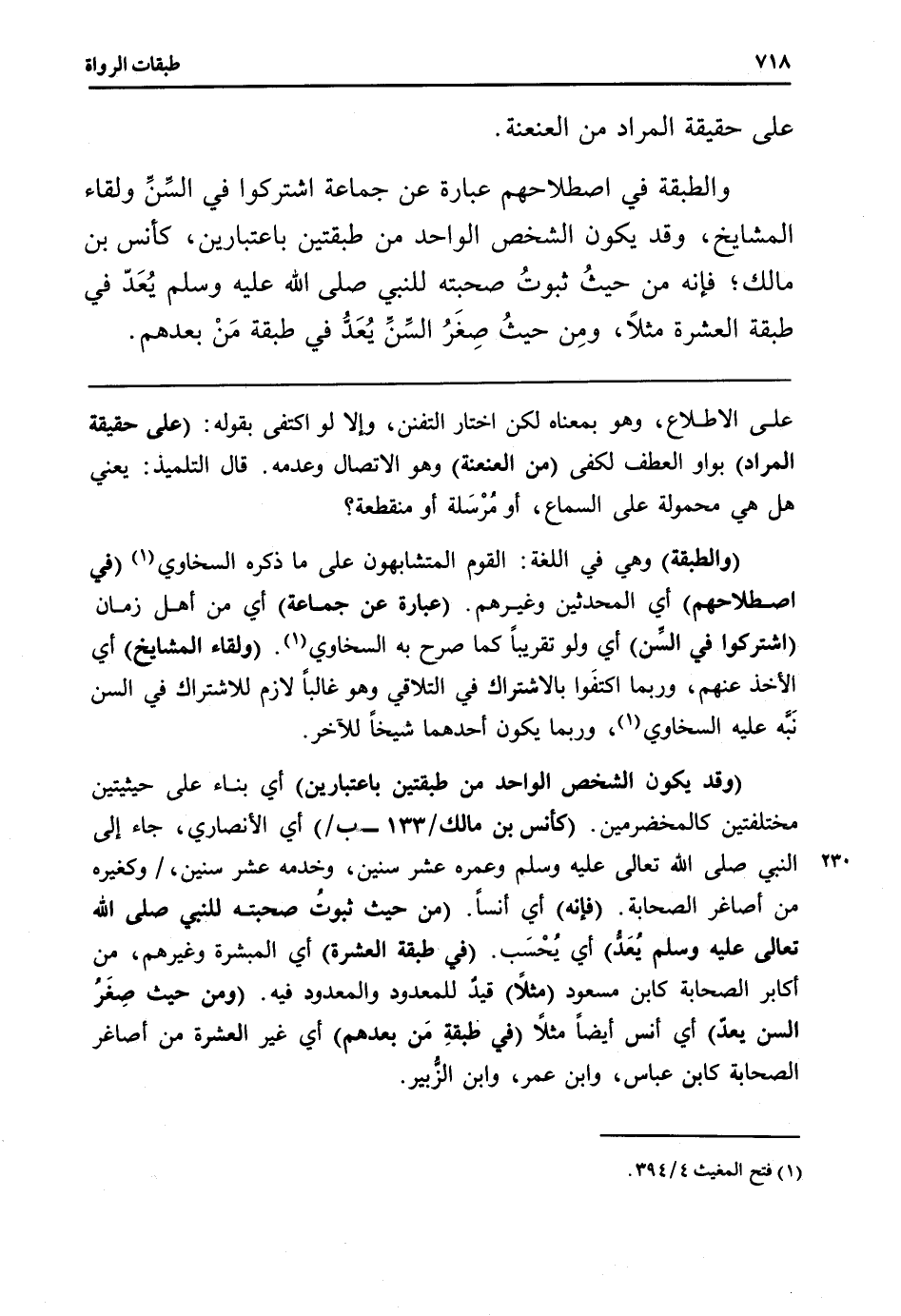 (وَقد يكون الشَّخْص الْوَاحِد من طبقتين باعتبارين) أَي بِنَاء على حيثيتين مختلفتين كالمخضرمين. (كأنس بن مَالك / 133 - ب /) أَي الْأنْصَارِيّ، جَاءَ إِلَى النَّبِي صلى الله تَعَالَى عَلَيْهِ وَسلم وعمره عشر سِنِين، وخدمه عشر سِنِين، / وكغيره من أصاغر الصَّحَابَة. (فَإِنَّهُ) أَي أنسا. (من حَيْثُ ثبوتُ صحبته للنَّبِي صلى الله تَعَالَى عَلَيْهِ وَسلم يُعَدُّ) أَي يُحْسَب. (فِي طبقَة الْعشْرَة) أَي المبشرة وَغَيرهم، من أكَابِر الصَّحَابَة كَابْن مَسْعُود (مثلا) قيدٌ للمعدود والمعدود فِيهِ. (وَمن حَيْثُ صِغَرٌ السن يعدّ) أَي أنس أَيْضا مثلا (فِي طبقةٍ مَن بعدهمْ) أَي غير الْعشْرَة من أصاغر الصَّحَابَة كَابْن عَبَّاس، وَابْن عمر، وَابْن الزَّبير.