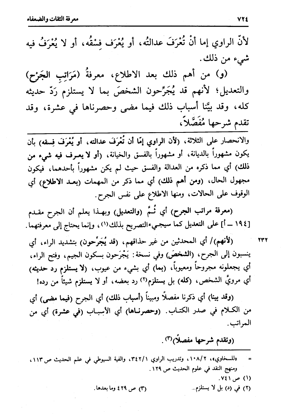 والانحصار على الثَّلَاثَة، (لِأَن الرَّاوِي إمّا أَن تُعْرفَ عَدَالَته، أَو يُعْرَف فِسقه) بِأَن يكون مَشْهُورا بالديانة، أَو مَشْهُورا بِالْفِسْقِ والخيانة، (أَو لَا يعرف فِيهِ شَيْء من ذَلِك) أَي مِمَّا ذكره من الْعَدَالَة وَالْفِسْق حَيْثُ لم يكن مَشْهُورا بِأَحَدِهِمَا، فَيكون مَجْهُول الْحَال، (وَمن أهم ذَلِك) أَي مِمَّا ذكر من الْمُهِمَّات (بعد الِاطِّلَاع) أَي الْوُقُوف على الْحَالَات، وَمِنْهَا الِاطِّلَاع على نفس الْجرْح.