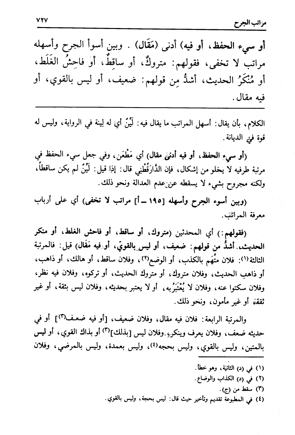 والمرتبة الرَّابِعَة: فلَان فِيهِ مقَال، وَفُلَان ضَعِيف، [أَو فِيهِ ضعف] أَو فِي حَدِيثه ضعف، وَفُلَان يعرف وينكر، وَفُلَان لَيْسَ [بذلك] أَو بِذَاكَ الْقوي، أَو لَيْسَ بالمتين، وَلَيْسَ بِالْقَوِيّ، وَلَيْسَ بِحجَّة، وَلَيْسَ بعمدة، وَلَيْسَ بالمرضي، وَفُلَان