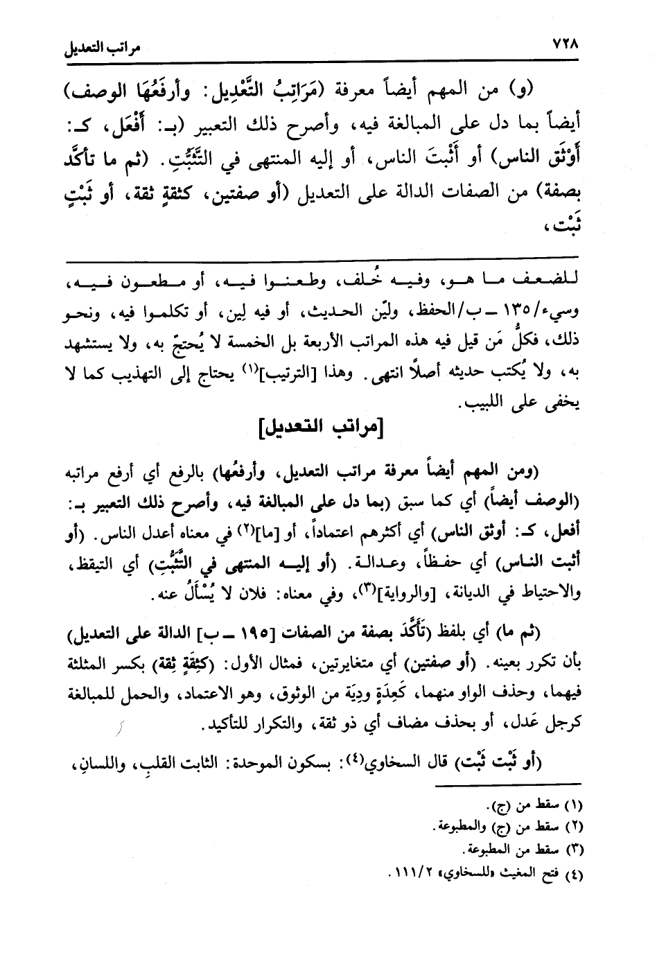 (وَمن المهم أَيْضا معرفَة مَرَاتِب التَّعْدِيل، وأرفعُها) بِالرَّفْع أَي أرفع مراتبه (الْوَصْف أَيْضا) أَي كَمَا سبق (بِمَا دلّ على الْمُبَالغَة فِيهِ، وأصرح ذَلِك التَّعْبِير ب: أفعل، ك: أوثق النَّاس) أَي أَكْثَرهم اعْتِمَادًا، أَو [مَا] فِي مَعْنَاهُ أعدل النَّاس. (أَو أثبت النَّاس) أَي حفظا، وعدالة. (أَو إِلَيْهِ الْمُنْتَهى فِي التَّثَبُّتِ) أَي التيقظ، وَالِاحْتِيَاط فِي الدّيانَة، [وَالرِّوَايَة] ، وَفِي مَعْنَاهُ: فلَان لَا يُسْأَلُ عَنهُ.