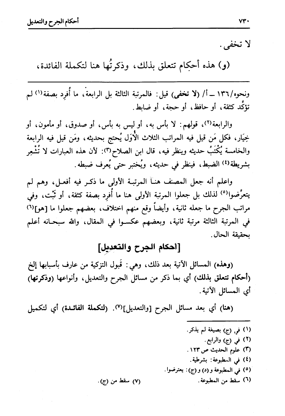 وَنَحْوه / 136 - أ / (لَا تخفى) قيل: فالمرتبة الثَّالِثَة بل الرَّابِعَة، مَا أُفرِد بِصفة لم تؤكَّد كثقة، أَو حَافظ، أَو حجَّة، أَو ضَابِط. وَالرَّابِعَة، قَوْلهم: لَا بَأْس بِهِ، أَو لَيْسَ بِهِ بَأْس، أَو صَدُوق، أَو مَأْمُون، أَو خيَار، فَكل مَن قيل فِيهِ الْمَرَاتِب الثَّلَاث الأوَل يُحتج بحَديثه، ومَن قيل فِيهِ الرَّابِعَة وَالْخَامِسَة يُكْتَبُ حَدِيثه وَينظر فِيهِ، قَالَ ابْن الصّلاح: لِأَن هَذِه الْعبارَات لَا تُشْعِر بشريطة الضَّبْط، فَينْظر فِي حَدِيثه، ويُختبر حَتَّى يُعرف ضَبطه.