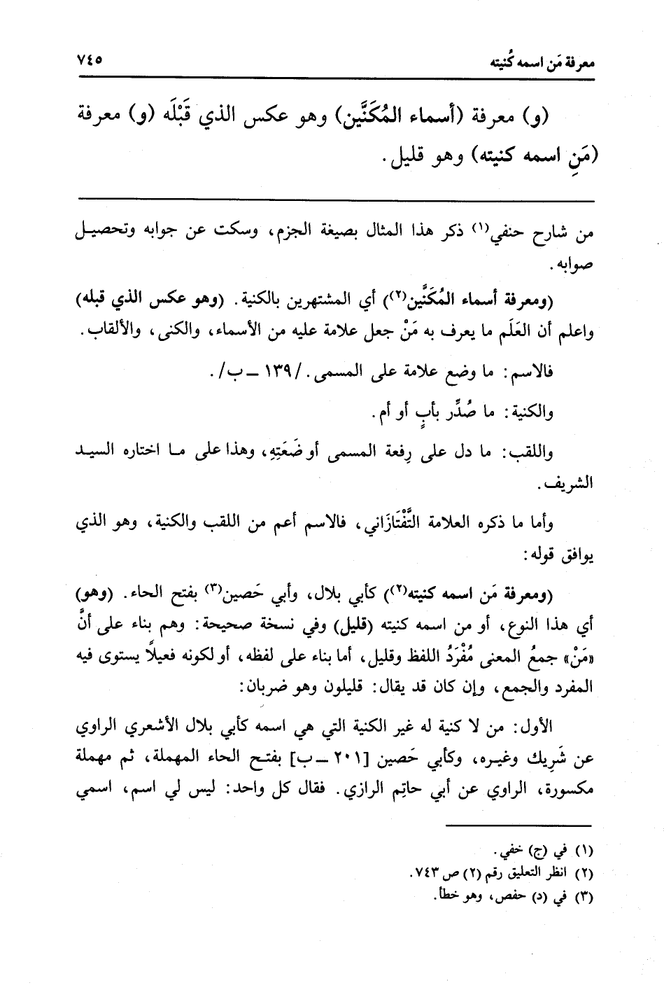 وَأما مَا ذكره الْعَلامَة التَّفْتَازَاني، فالاسم أَعم من اللقب والكنية، وَهُوَ الَّذِي يُوَافق قَوْله: