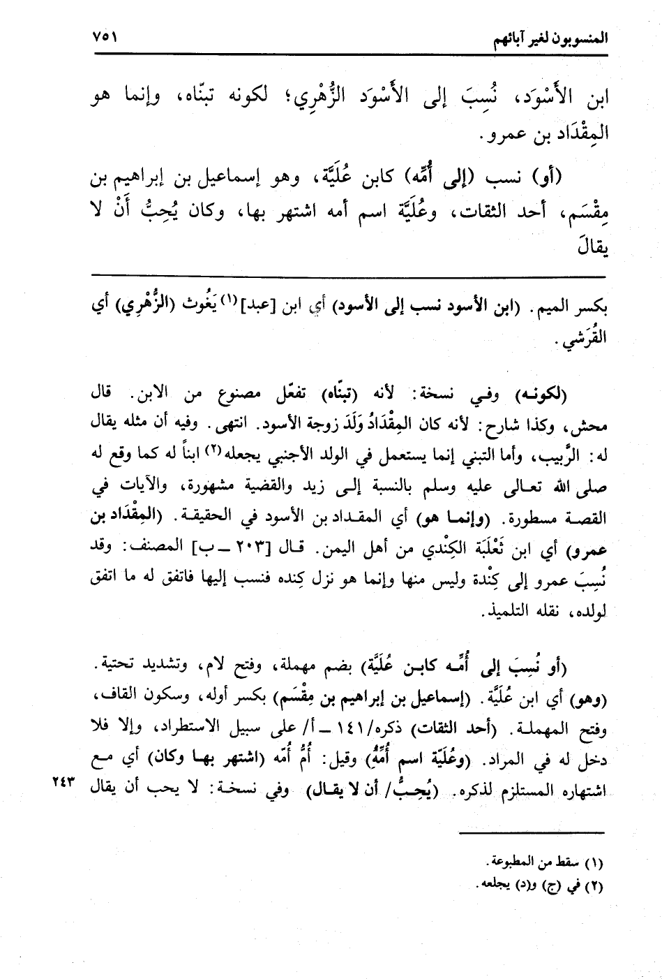 (أَو نُسِبَ إِلَى أُمّه كَابْن عُلَية) بِضَم مُهْملَة، وَفتح لَام، وَتَشْديد تحتية. (وَهُوَ) أَي ابْن عُلَيَّة. (إِسْمَاعِيل بن إِبْرَاهِيم بن مِقْسم) بِكَسْر أَوله، وَسُكُون الْقَاف، وَفتح الْمُهْملَة. (أحد الثِّقَات) ذكره / 141 - أ / على سَبِيل الاستطراد، وَإِلَّا فَلَا دخل لَهُ فِي المُرَاد. (وَعليَّة اسْم أمِّهُ) وَقيل: (اشْتهر بهَا وَكَانَ) أَي مَعَ اشتهاره المستلزم لذكره. (يجب أَن لَا يُقَال وَفِي نُسْخَة: لَا يحب أَن يُقَال