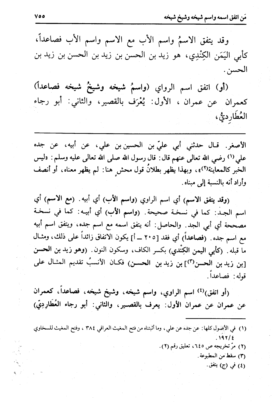 (وَقد يتَّفق الِاسْم) أَي اسْم الرَّاوِي (وَاسم الْأَب) أَي أَبِيه. (مَعَ الِاسْم) أَي اسْم الْجد: كَمَا فِي نُسْخَة صَحِيحَة. (وَاسم الْأَب) أَي أَبِيه: كَمَا فِي نُسْخَة مصححة أَي أبي الْجد. وَالْحَاصِل: أَنه يتَّفق اسْمه مَعَ اسْم جده، ويتفق اسْم أَبِيه مَعَ اسْم جده. (فَصَاعِدا) أَي فقد [205 - أ] يكون الِاتِّفَاق زَائِدا على ذَلِك، وَمِثَال مَا قبله. (كَأبي الْيمن الْكِنْدِيّ) بِكَسْر الْكَاف، وَسُكُون النُّون. (وَهُوَ زيد بن الْحسن [بن زيد بن الْحسن] بن زيد بن الْحسن) فَكَانَ الأنسبُ تَقْدِيم الْمِثَال على قَوْله: فَصَاعِدا.