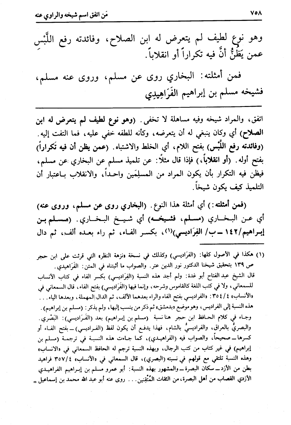(فَمن أمثلته:) أَي أَمْثِلَة هَذَا النَّوْع. (البُخَارِيّ روى عَن مُسلم، وروى عَنهُ) أَي عَن البُخَارِيّ (مُسلم، فشيخه) أَي شيخ البُخَارِيّ. (مُسلم بن إِبْرَاهِيم / 142 - ب / الفِرَاديسي) ، بِكَسْر الْفَاء، ثمَّ رَاء بعده ألف، ثمَّ دَال