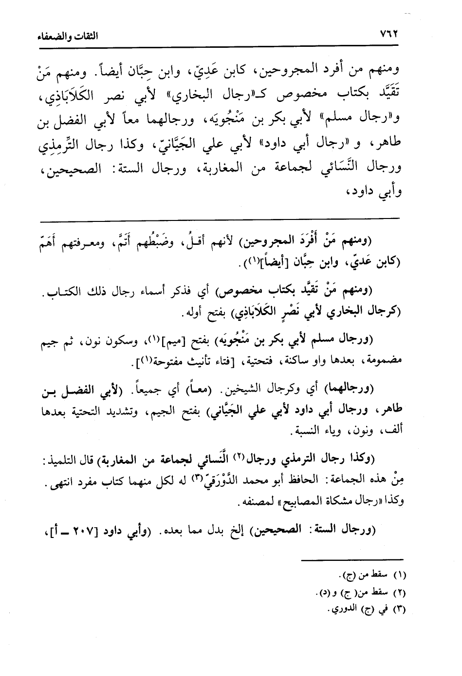 (وَمِنْهُم مَنْ تَقيَّد بِكِتَاب مَخْصُوص) أَي فَذكر أَسمَاء رجال ذَلِك الْكتاب. (كرجال البُخَارِيّ لأبي نَصْرٍ الكَلاَبَاذِي) بِفَتْح أَوله.